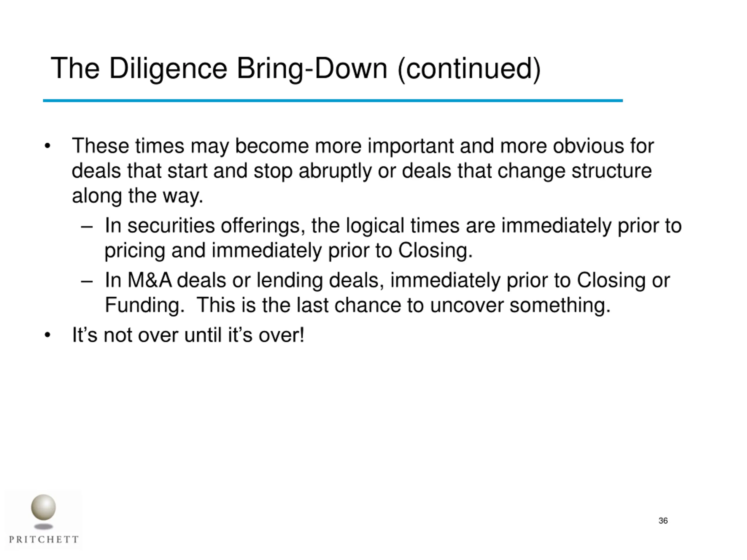 The Diligence Bring-Down Continue to pay attention over several months some transactions are protracted. It continues until the DAY OF CLOSING. Everybody has a story about something happening right before Closing! Since transactions have a life of their own do NOT forget to do a bring-down of your diligence one or more times as the transaction evolves. 35