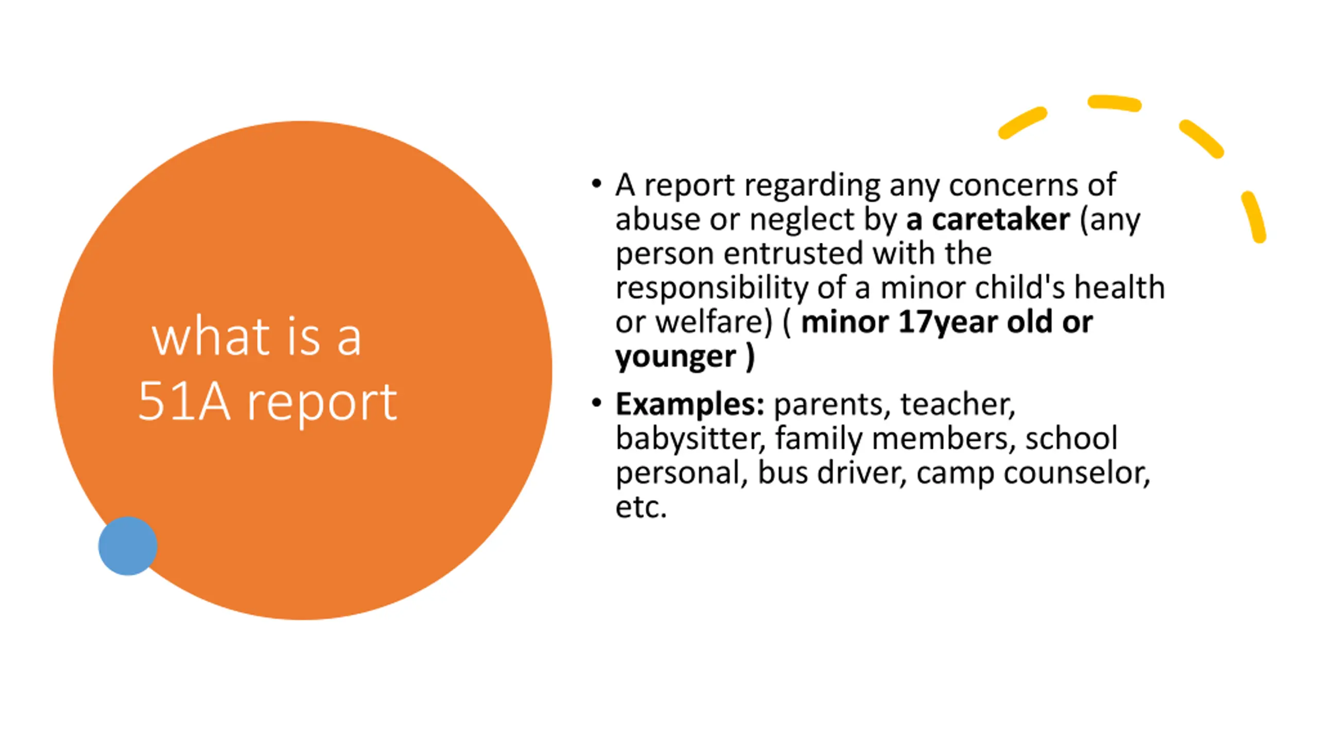 A report regarding any concerns of abuse or neglect by a caretaker (any person entrusted with the responsibility of a minor child's health or welfare) ( minor 17year old or younger ) Examples: parents, teacher, babysitter, family members, school personal, bus driver, camp counselor, etc. what is a 51A report