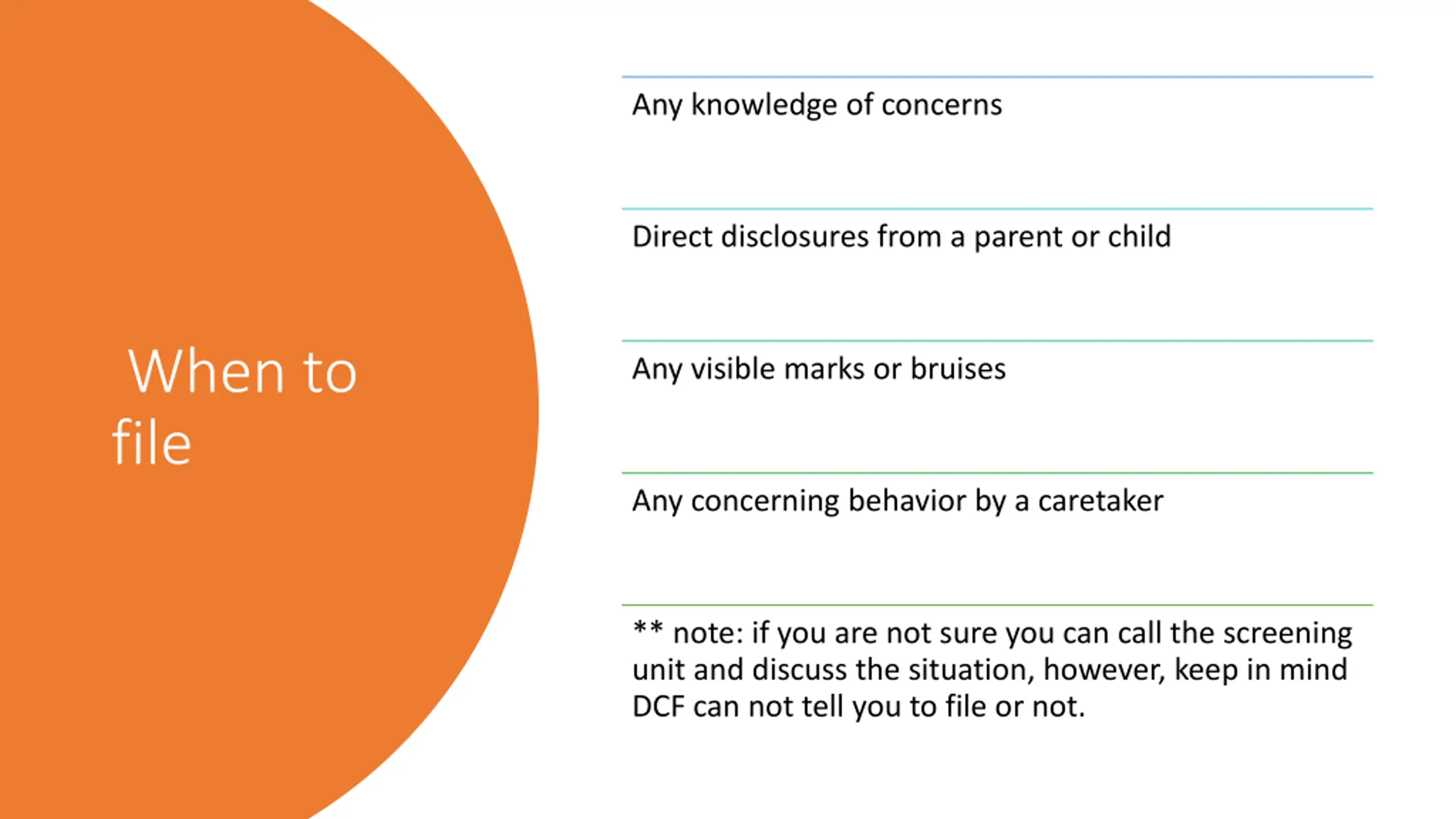 Any knowledge of concerns Direct disclosures from a parent or child When to file Any visible marks or bruises Any concerning behavior by a caretaker ** note: if you are not sure you can call the screening unit and discuss the situation, however, keep in mind DCF can not tell you to file or not.