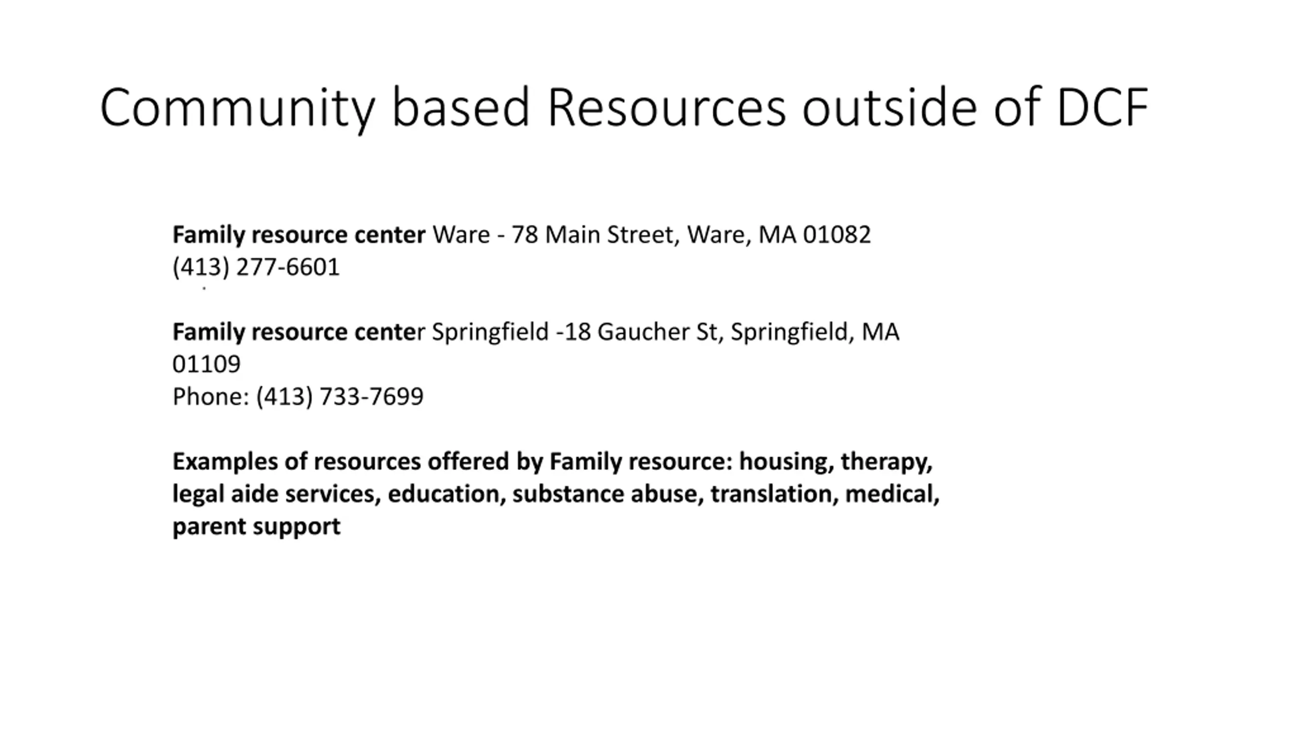 Community based Resources outside of DCF Family resource center Ware - 78 Main Street, Ware, MA 01082 (413) 277-6601 Family resource center Springfield -18 Gaucher St, Springfield, MA 01109 Phone: (413) 733-7699 Examples of resources offered by Family resource: housing, therapy, legal aide services, education, substance abuse, translation, medical, parent support