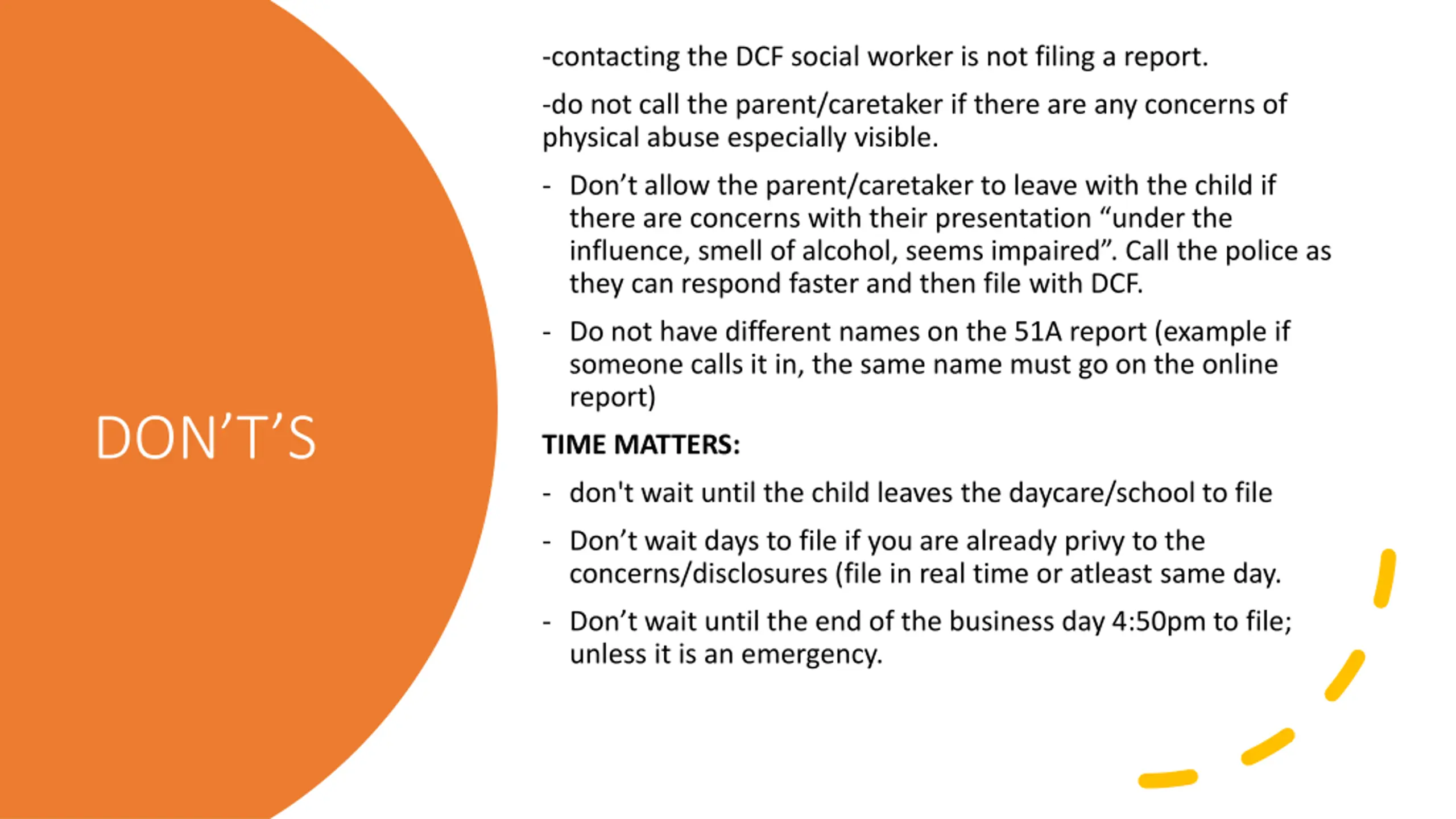 -contacting the DCF social worker is not filing a report. -do not call the parent/caretaker if there are any concerns of physical abuse especially visible. - Don t allow the parent/caretaker to leave with the child if there are concerns with their presentation under the influence, smell of alcohol, seems impaired . Call the police as they can respond faster and then file with DCF. - Do not have different names on the 51A report (example if someone calls it in, the same name must go on the online report) DON T S TIME MATTERS: - don't wait until the child leaves the daycare/school to file - Don t wait days to file if you are already privy to the concerns/disclosures (file in real time or atleast same day. - Don t wait until the end of the business day 4:50pm to file; unless it is an emergency.