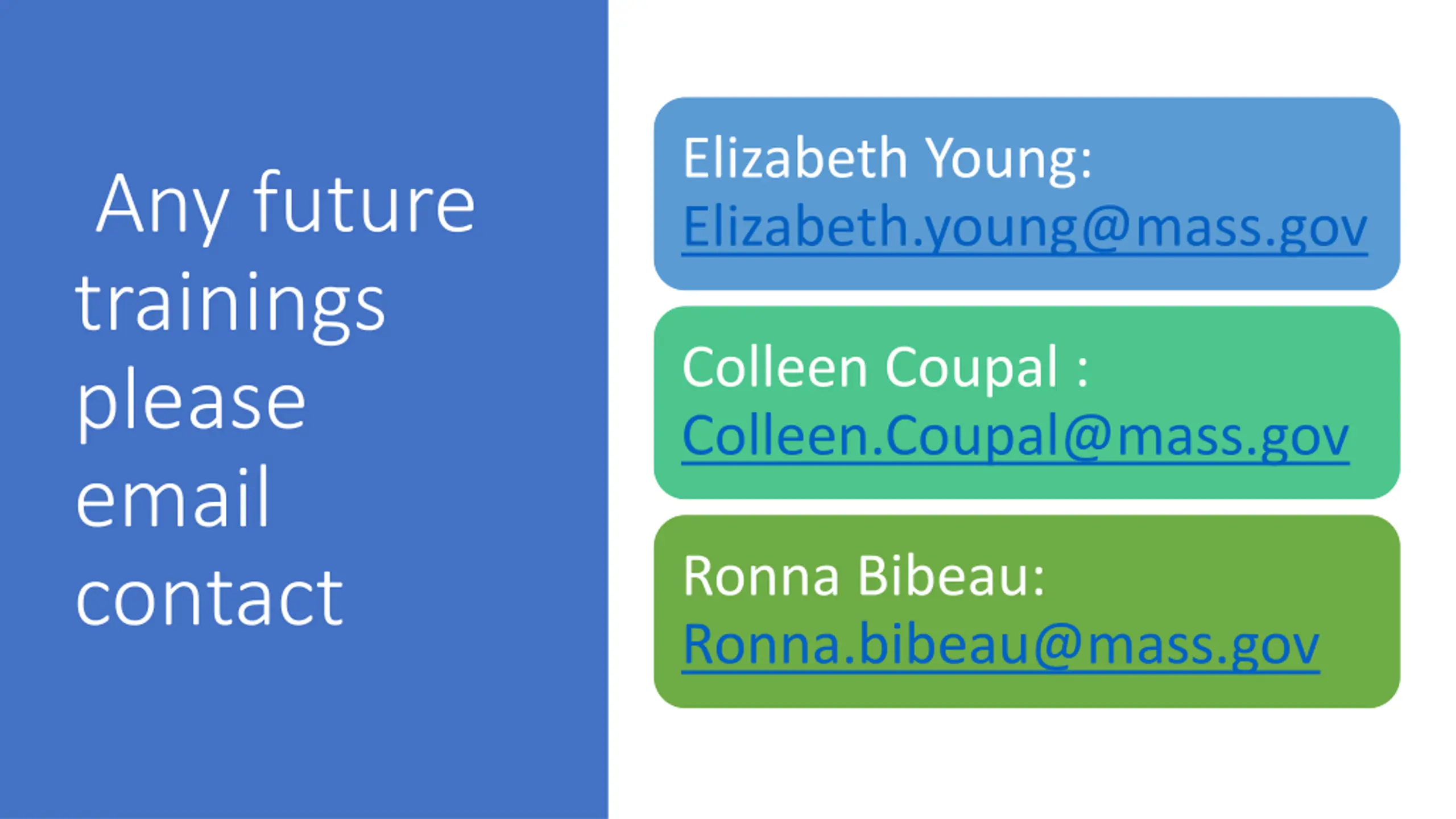 Elizabeth.young@mass.gov Elizabeth Young: Elizabeth.young@mass.gov Any future trainings please email contact Colleen.Coupal@mass.gov Colleen Coupal : Colleen.Coupal@mass.gov Ronna.bibeau@mass.gov Ronna Bibeau: Ronna.bibeau@mass.gov