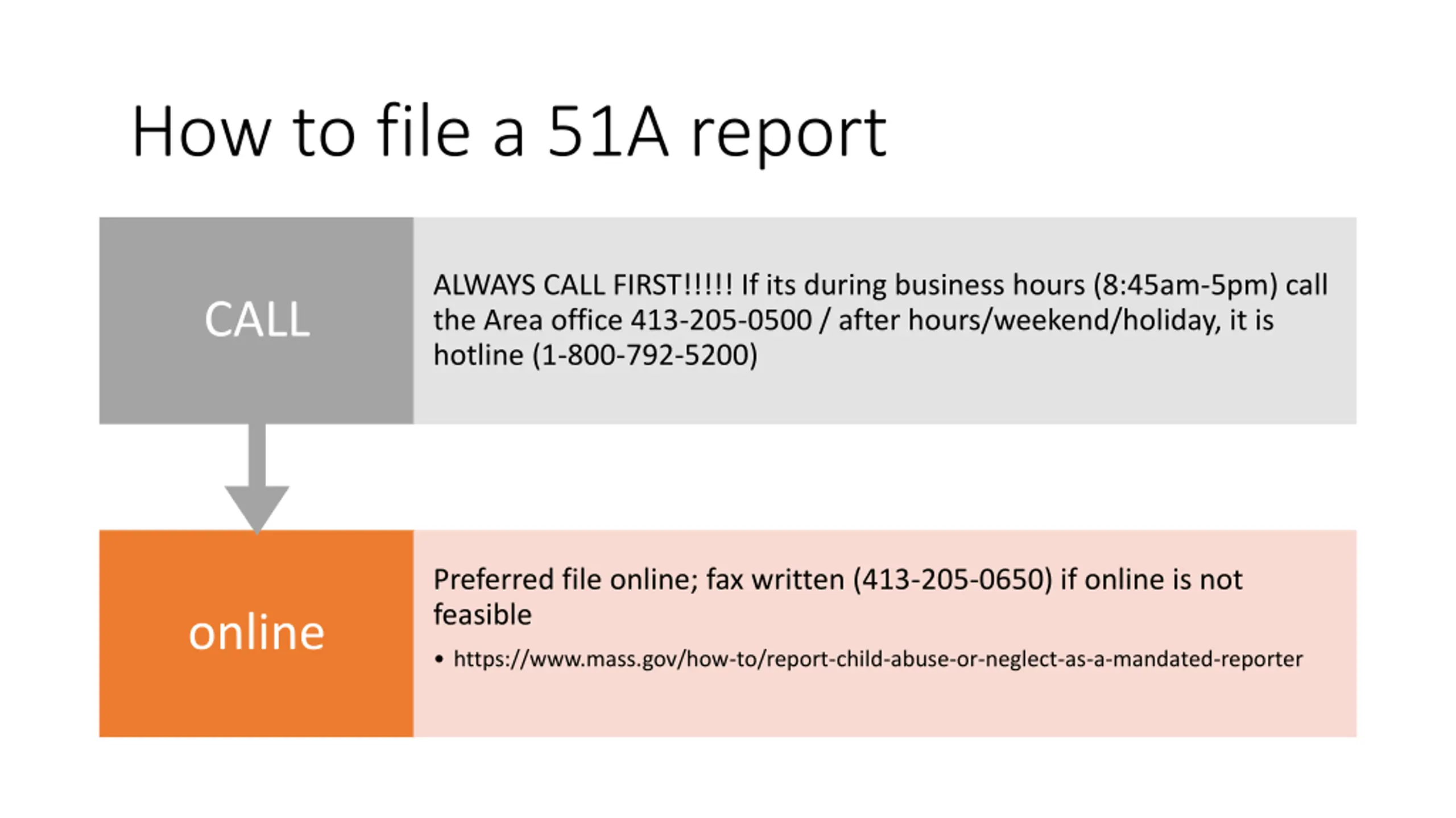 How to file a 51A report ALWAYS CALL FIRST!!!!! If its during business hours (8:45am-5pm) call the Area office 413-205-0500 / after hours/weekend/holiday, it is hotline (1-800-792-5200) CALL Preferred file online; fax written (413-205-0650) if online is not feasible online https://www.mass.gov/how-to/report-child-abuse-or-neglect-as-a-mandated-reporter