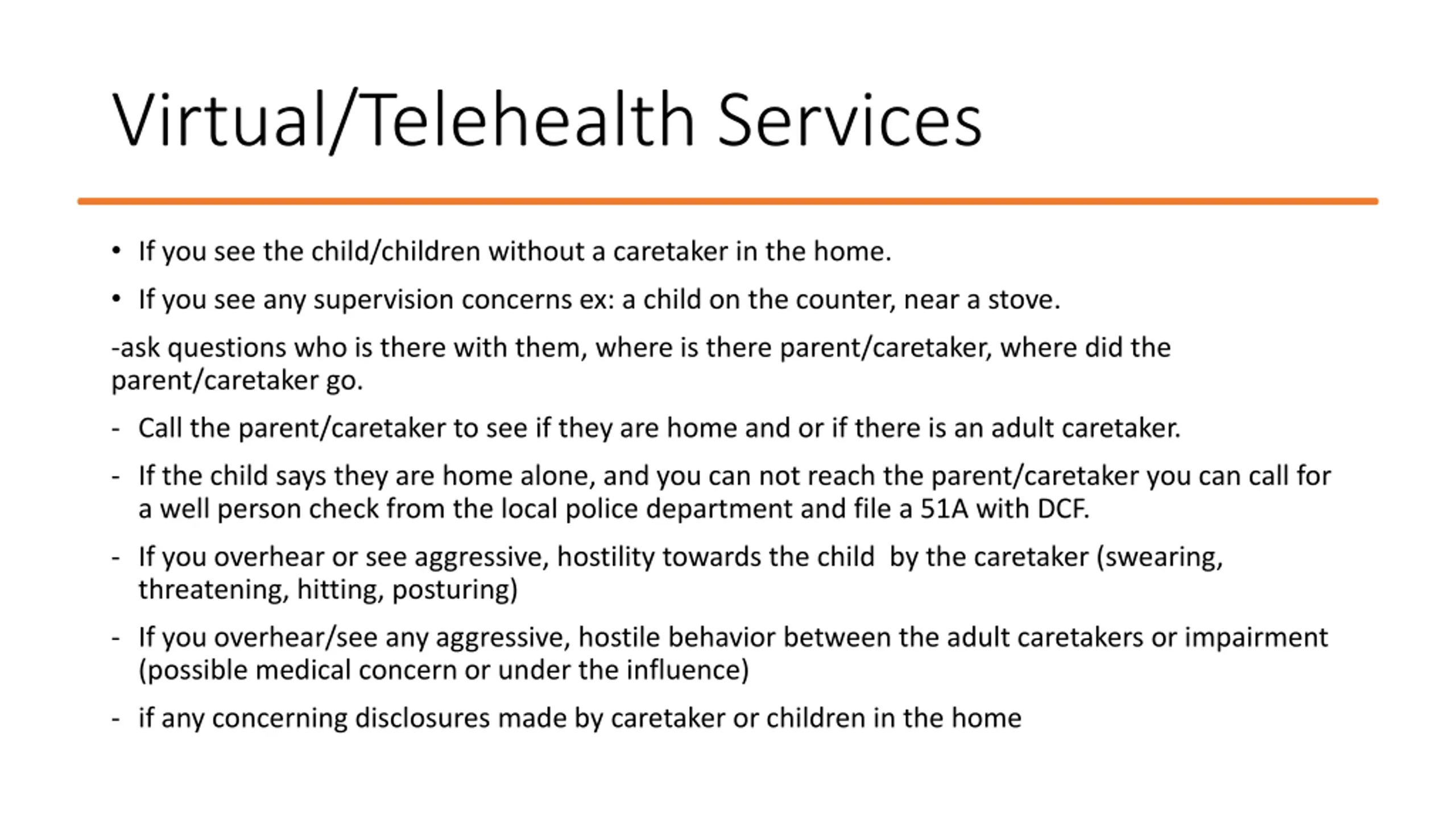 Virtual/Telehealth Services If you see the child/children without a caretaker in the home. If you see any supervision concerns ex: a child on the counter, near a stove. -ask questions who is there with them, where is there parent/caretaker, where did the parent/caretaker go. - Call the parent/caretaker to see if they are home and or if there is an adult caretaker. - If the child says they are home alone, and you can not reach the parent/caretaker you can call for a well person check from the local police department and file a 51A with DCF. - If you overhear or see aggressive, hostility towards the child by the caretaker (swearing, threatening, hitting, posturing) - If you overhear/see any aggressive, hostile behavior between the adult caretakers or impairment (possible medical concern or under the influence) - if any concerning disclosures made by caretaker or children in the home