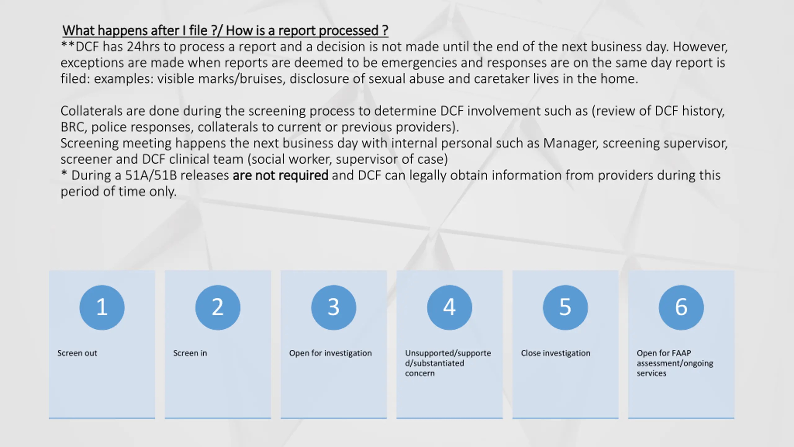What happens after I file ?/ How is a report processed ? What happens after I file ?/ How is a report processed ? **DCF has 24hrs to process a report and a decision is not made until the end of the next business day. However, exceptions are made when reports are deemed to be emergencies and responses are on the same day report is filed: examples: visible marks/bruises, disclosure of sexual abuse and caretaker lives in the home. Collaterals are done during the screening process to determine DCF involvement such as (review of DCF history, BRC, police responses, collaterals to current or previous providers). Screening meeting happens the next business day with internal personal such as Manager, screening supervisor, screener and DCF clinical team (social worker, supervisor of case) * During a 51A/51B releases are not required are not required and DCF can legally obtain information from providers during this period of time only. 1 2 3 4 5 6 Screen out Screen in Open for investigation Unsupported/supporte d/substantiated concern Close investigation Open for FAAP assessment/ongoing services