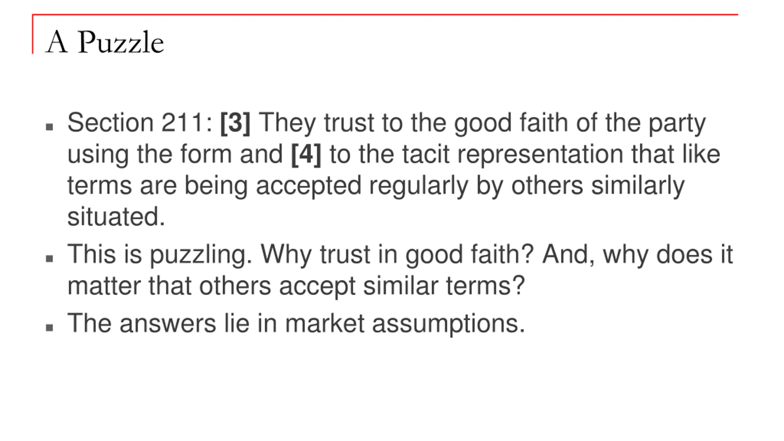 A Puzzle Section 211: [3] They trust to the good faith of the party using the form and [4] to the tacit representation that like terms are being accepted regularly by others similarly situated. This is puzzling. Why trust in good faith? And, why does it matter that others accept similar terms? The answers lie in market assumptions.