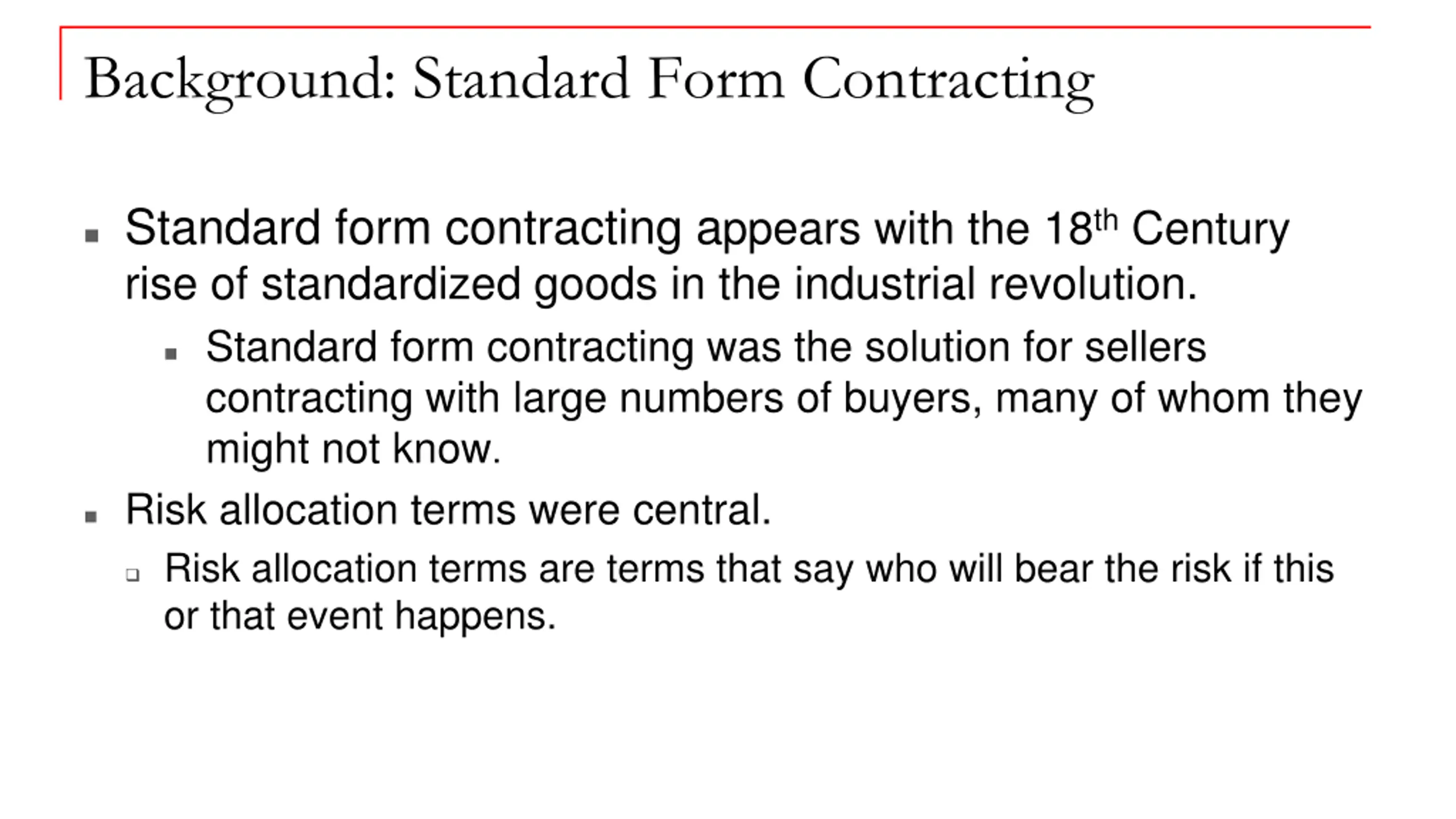 Background: Standard Form Contracting Standard form contracting appears with the 18thCentury rise of standardized goods in the industrial revolution. Standard form contracting was the solution for sellers contracting with large numbers of buyers, many of whom they might not know. Risk allocation terms were central. Risk allocation terms are terms that say who will bear the risk if this or that event happens.