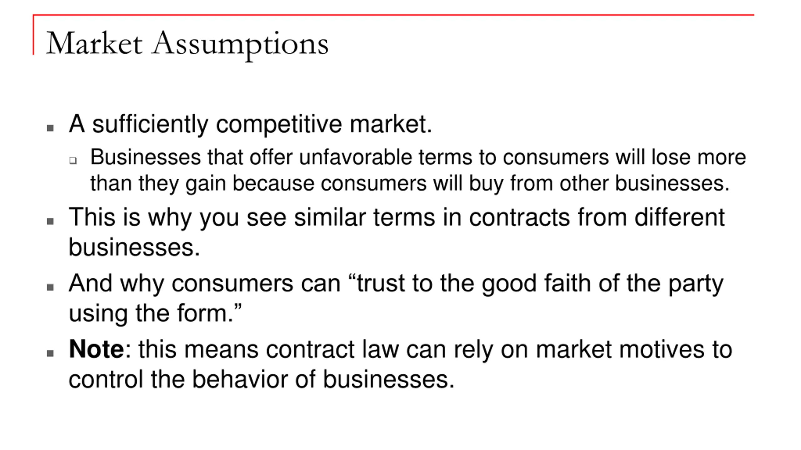 Market Assumptions A sufficiently competitive market. Businesses that offer unfavorable terms to consumers will lose more than they gain because consumers will buy from other businesses. This is why you see similar terms in contracts from different businesses. And why consumers can trust to the good faith of the party using the form. Note: this means contract law can rely on market motives to control the behavior of businesses.