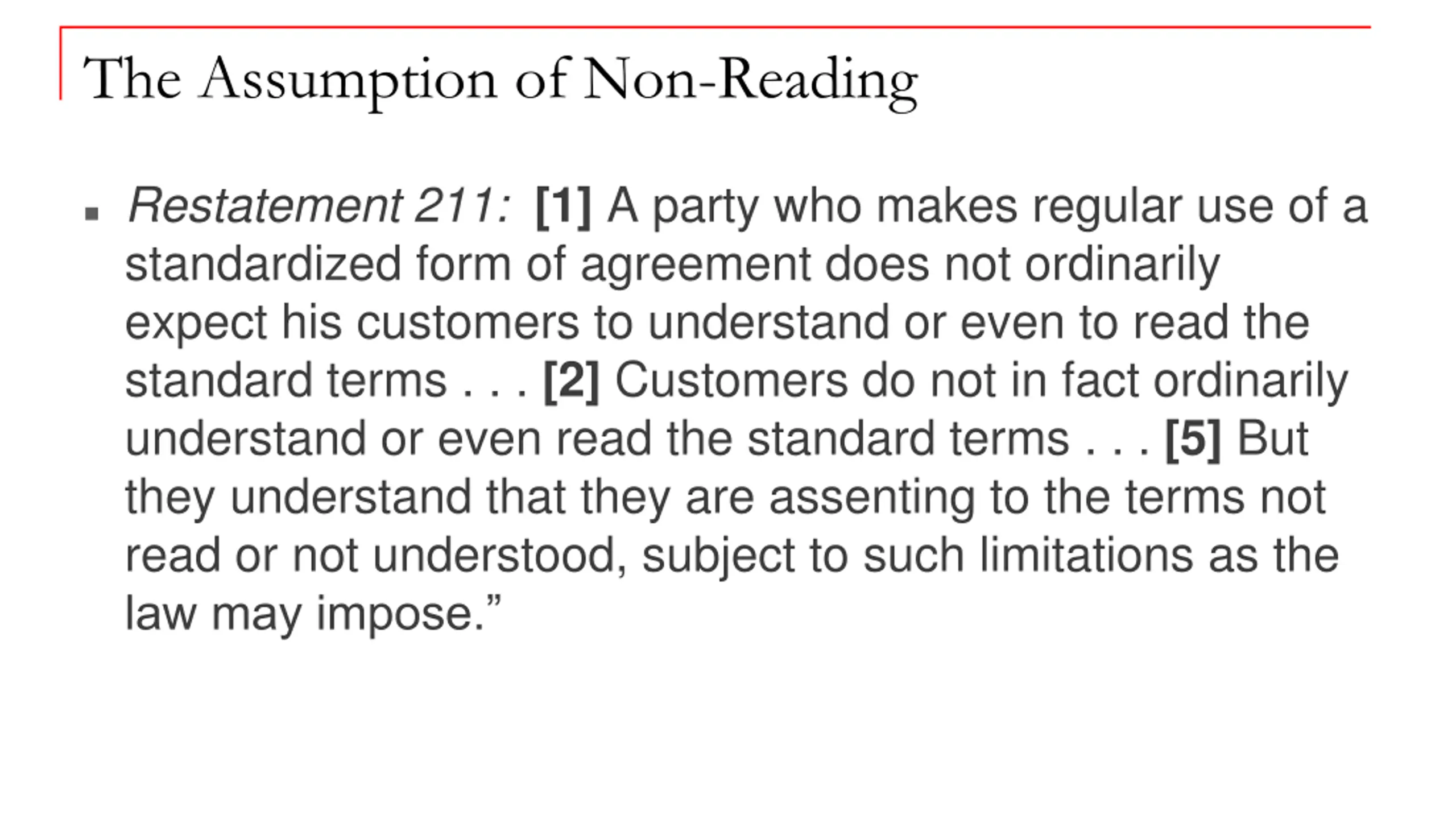 The Assumption of Non-Reading Restatement 211: [1] A party who makes regular use of a standardized form of agreement does not ordinarily expect his customers to understand or even to read the standard terms . . . [2] Customers do not in fact ordinarily understand or even read the standard terms . . . [5] But they understand that they are assenting to the terms not read or not understood, subject to such limitations as the law may impose.