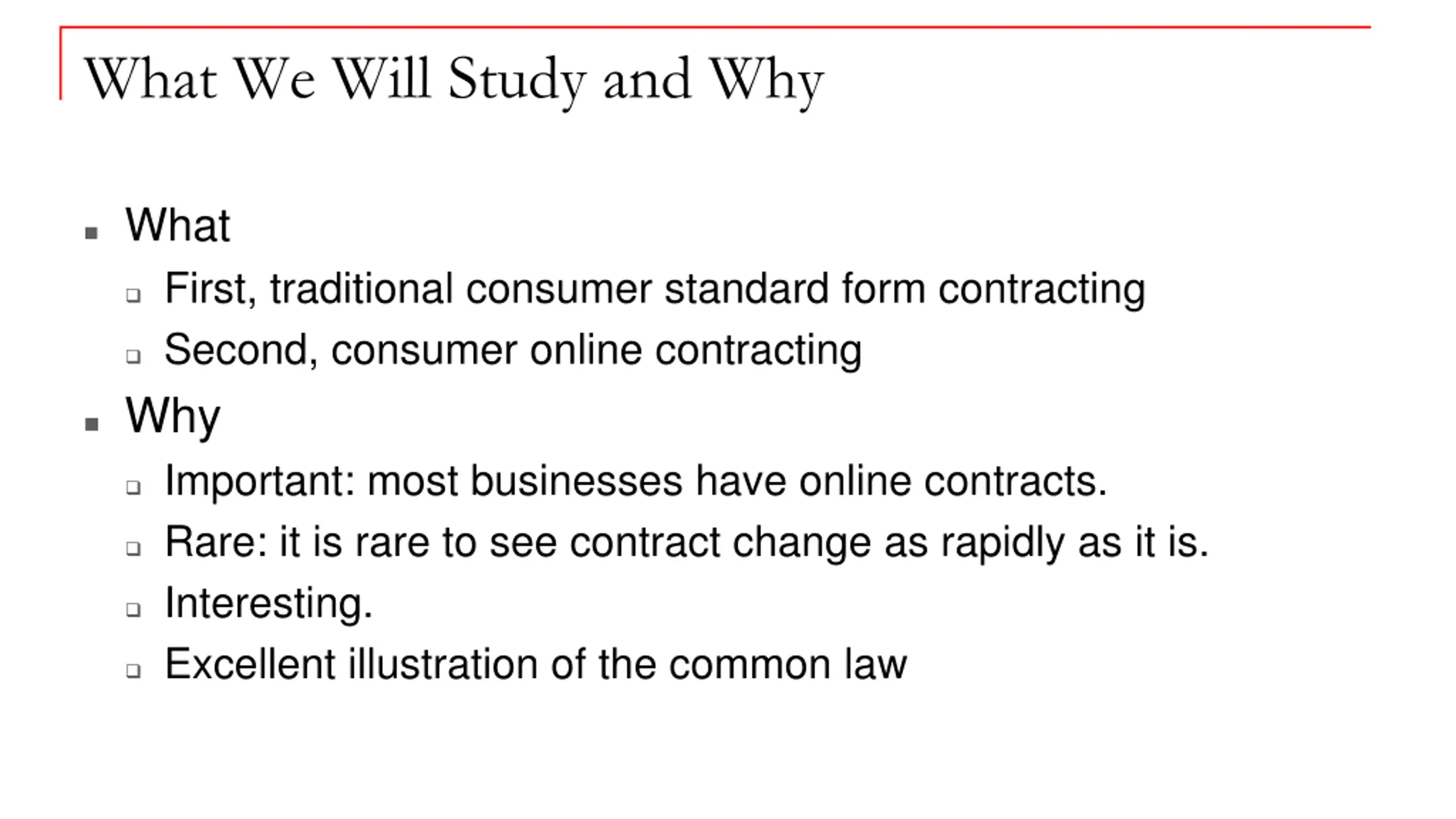 What We Will Study and Why What First, traditional consumer standard form contracting Second, consumer online contracting Why Important: most businesses have online contracts. Rare: it is rare to see contract change as rapidly as it is. Interesting. Excellent illustration of the common law