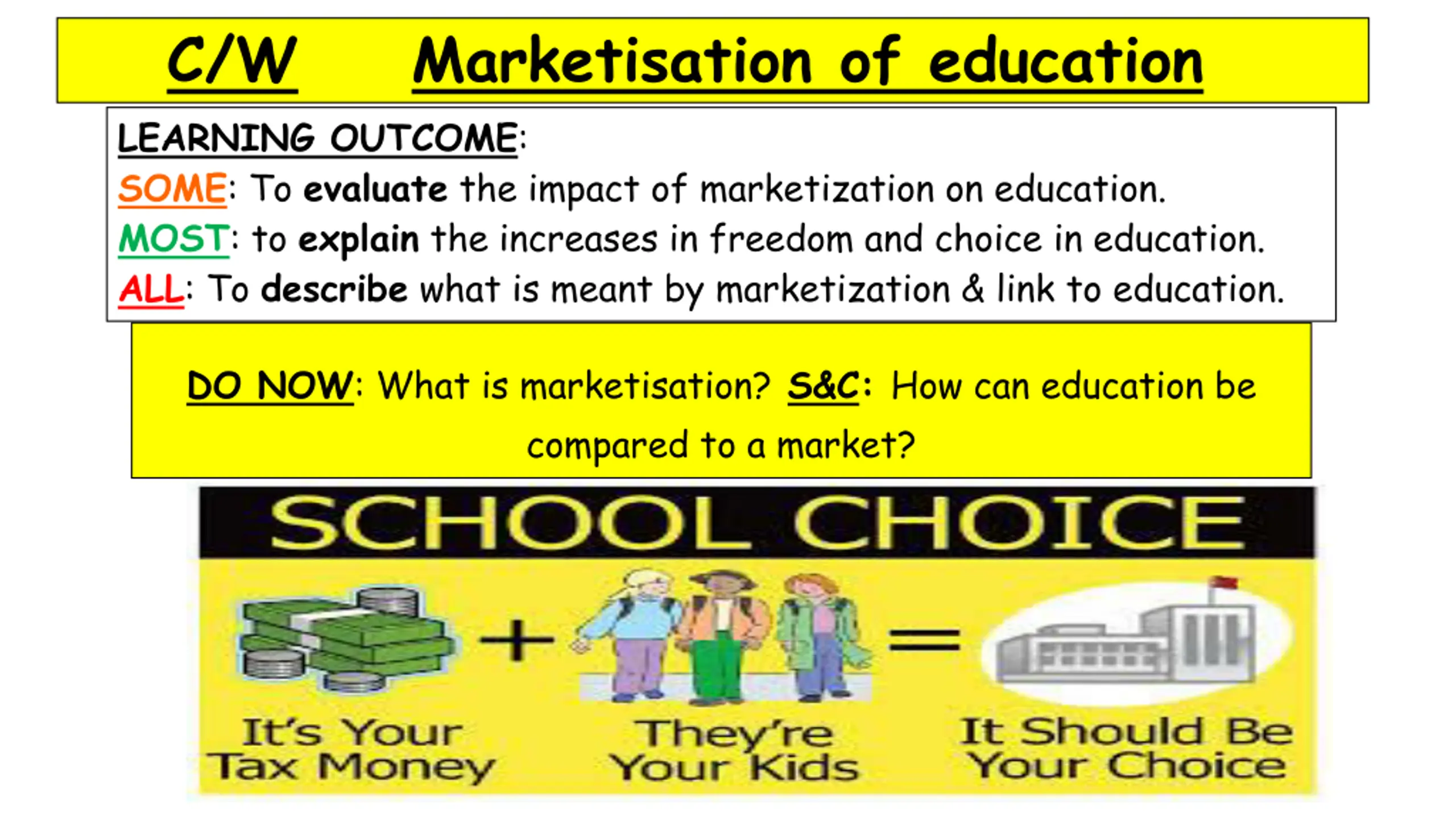C/W Marketisation of education LEARNING OUTCOME: SOME: To evaluate the impact of marketization on education. MOST: to explain the increases in freedom and choice in education. ALL: To describe what is meant by marketization & link to education. DO NOW: What is marketisation? S&C: How can education be compared to a market?