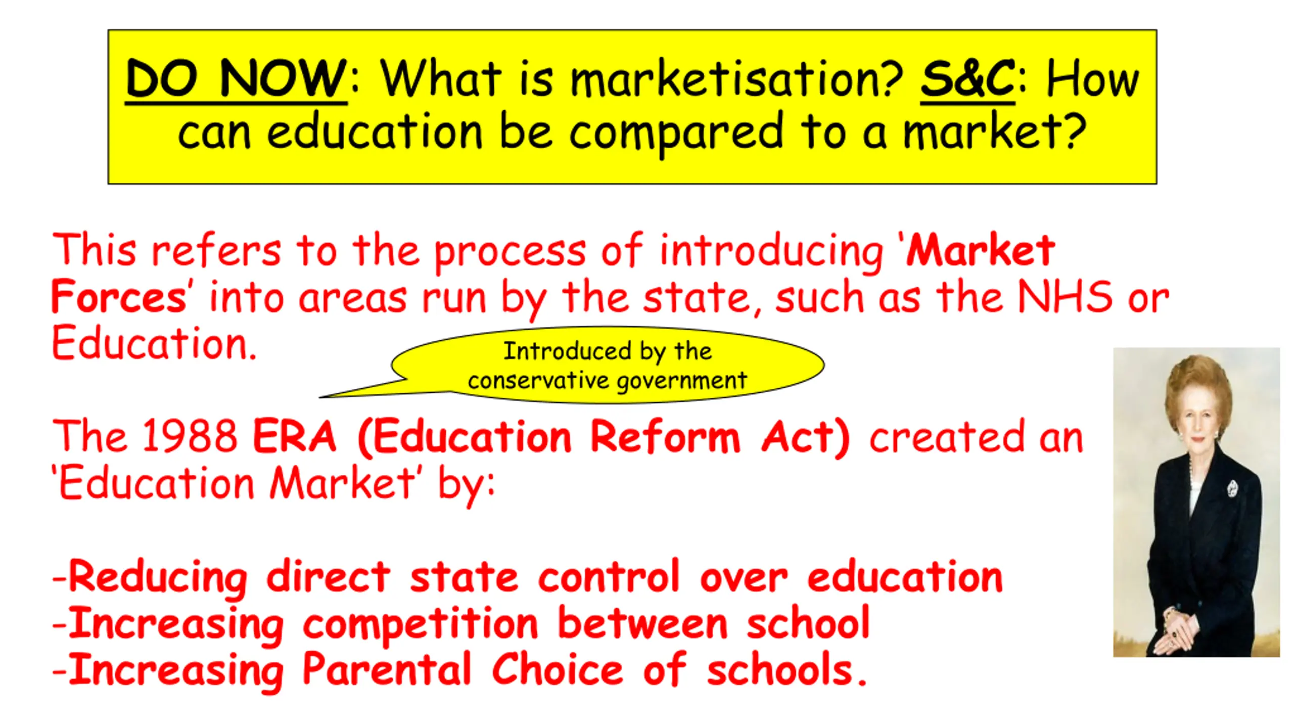 DO NOW: What is marketisation? S&C: How can education be compared to a market? This refers to the process of introducing Market Forces into areas run by the state, such as the NHS or Education. conservative government Introduced by the The 1988 ERA (Education Reform Act) created an Education Market by: -Reducing direct state control over education -Increasing competition between school -Increasing Parental Choice of schools.