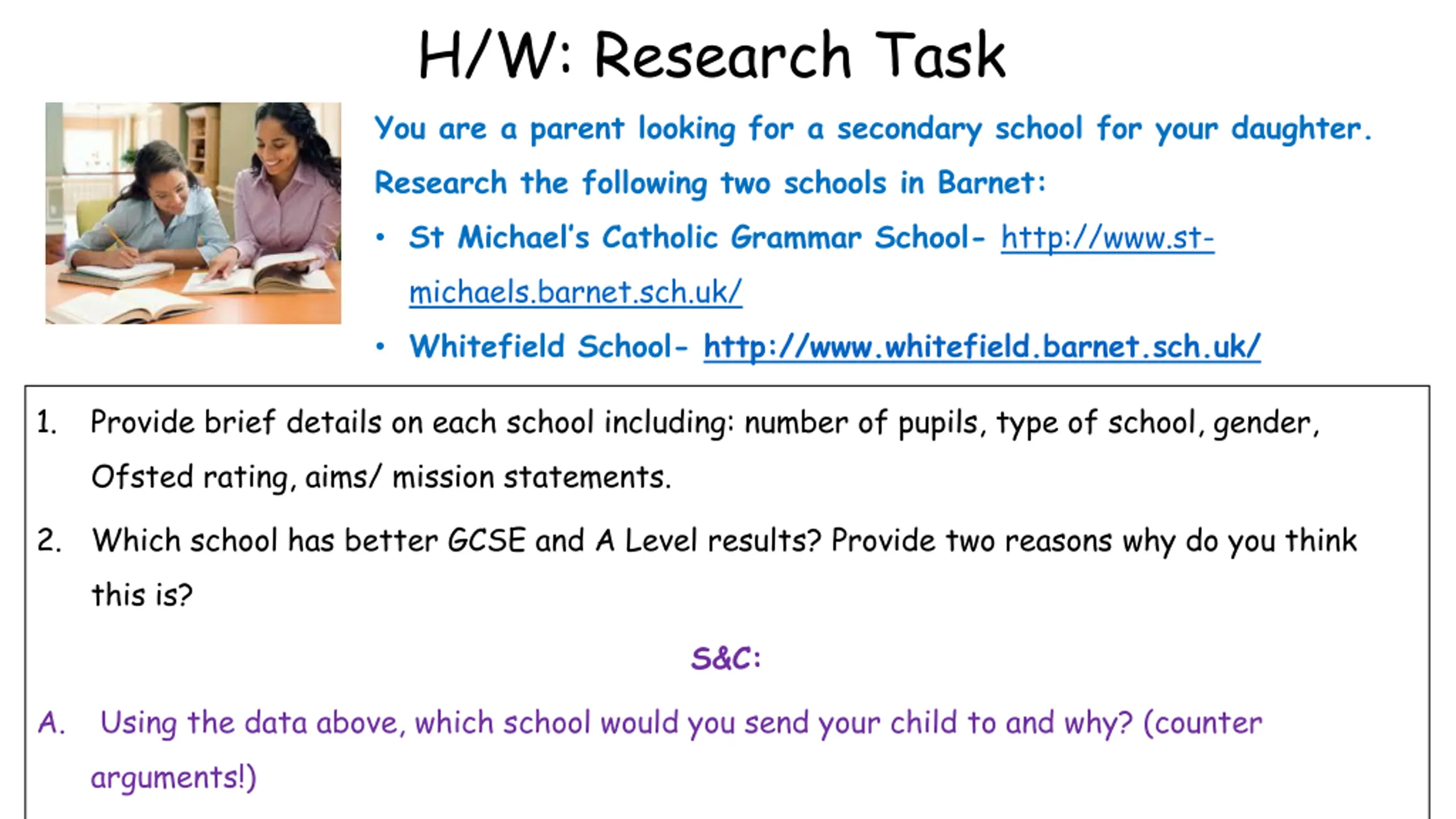 H/W: Research Task You are a parent looking for a secondary school for your daughter. Research the following two schools in Barnet: St Michael s Catholic Grammar School- http://www.st- michaels.barnet.sch.uk/ Whitefield School- http://www.whitefield.barnet.sch.uk/ 1. Provide brief details on each school including: number of pupils, type of school, gender, Ofsted rating, aims/ mission statements. 2. Which school has better GCSE and A Level results? Provide two reasons why do you think this is? S&C: A. Using the data above, which school would you send your child to and why? (counter arguments!)