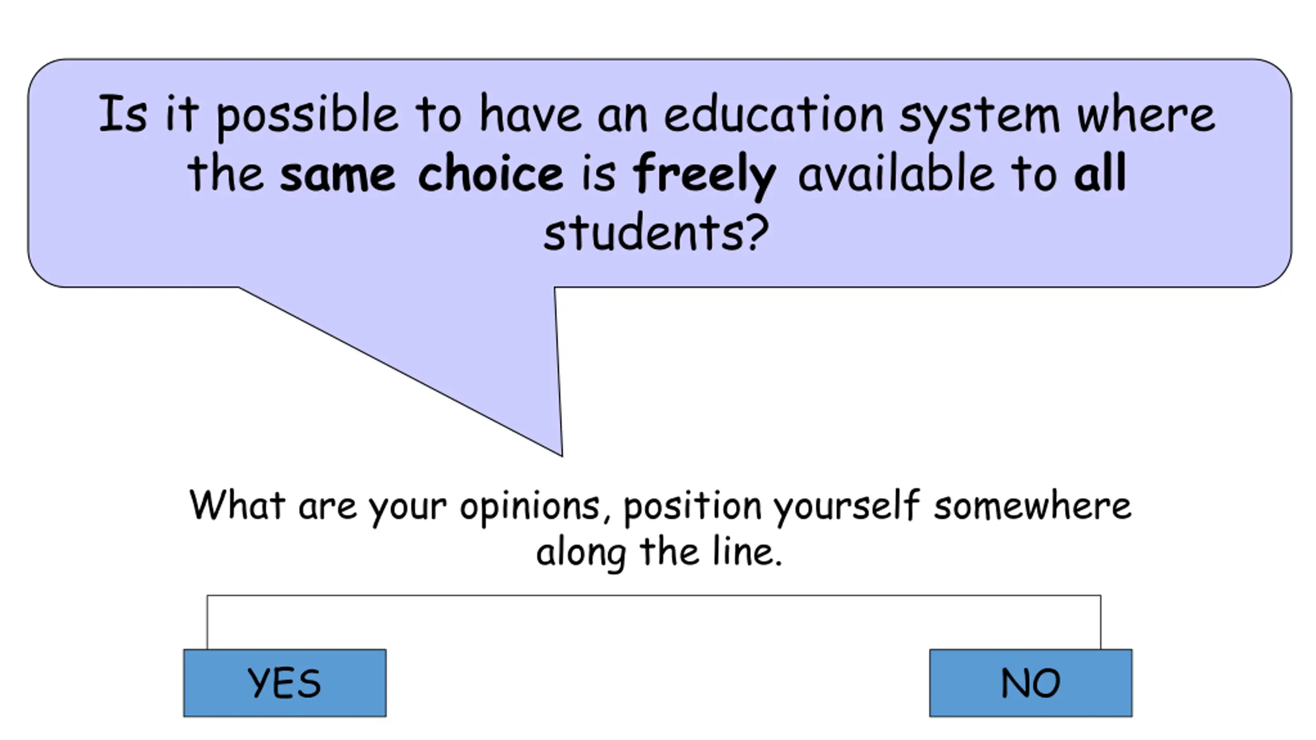 Is it possible to have an education system where the same choice is freely available to all students? What are your opinions, position yourself somewhere along the line. YES NO