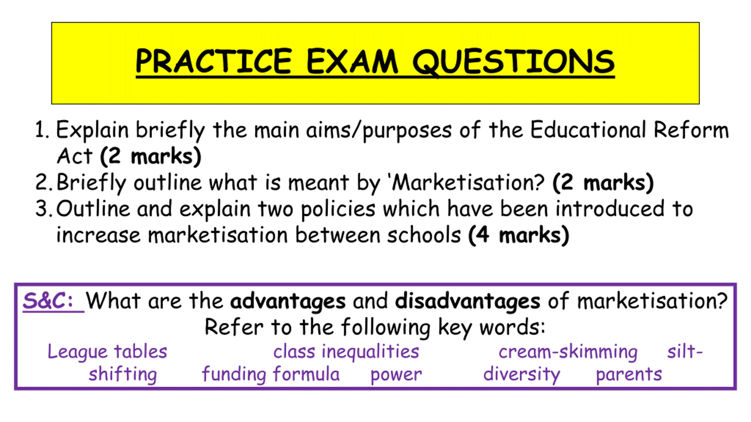 PRACTICE EXAM QUESTIONS 1. Explain briefly the main aims/purposes of the Educational Reform Act (2 marks) 2.Briefly outline what is meant by Marketisation? (2 marks) 3.Outline and explain two policies which have been introduced to increase marketisation between schools (4 marks) S&C: What are the advantages and disadvantages of marketisation? Refer to the following key words: League tables class inequalities shifting funding formula power cream-skimming diversity silt- parents