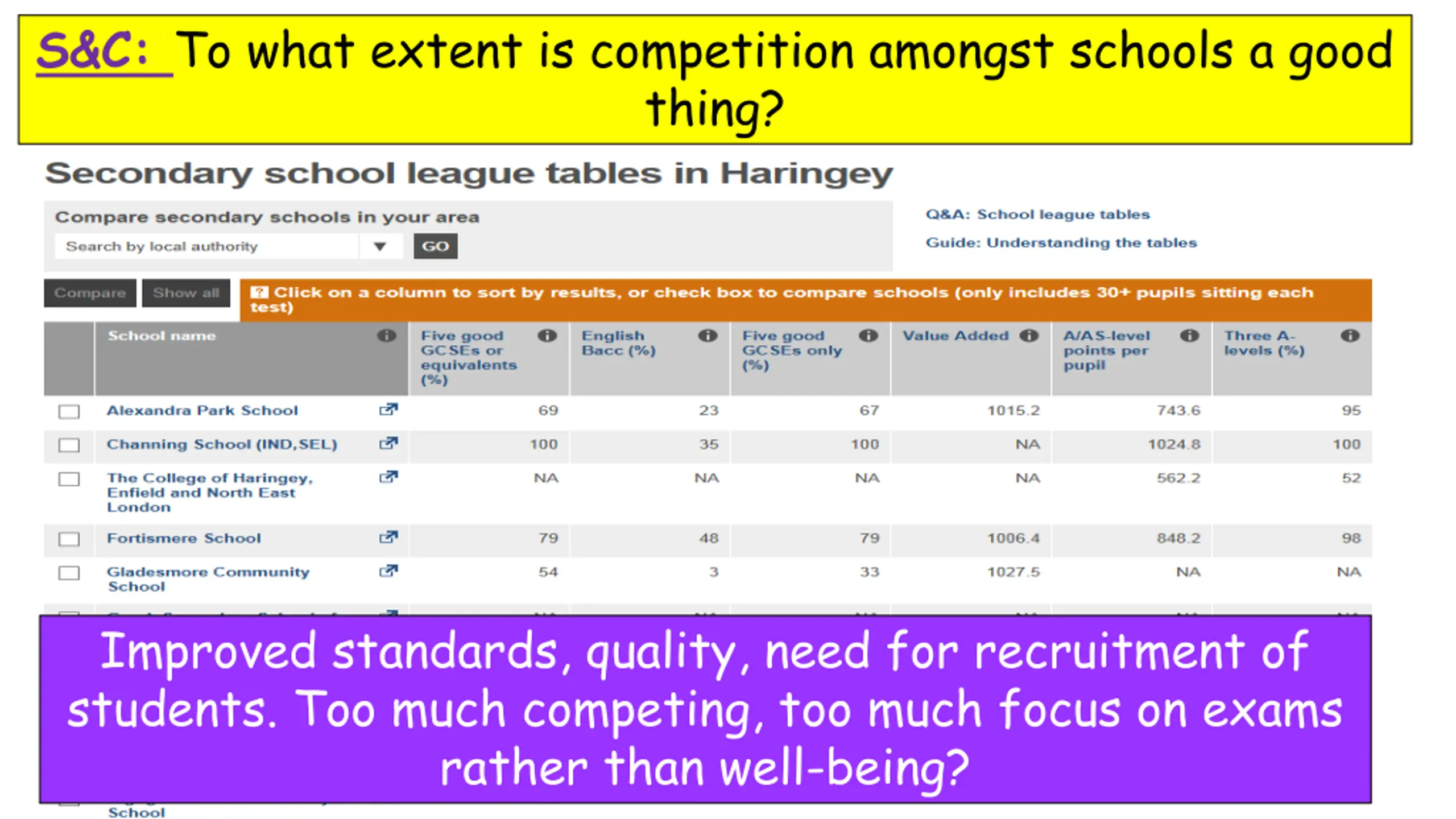 S&C: To what extent is competition amongst schools a good thing? Improved standards, quality, need for recruitment of students. Too much competing, too much focus on exams rather than well-being?