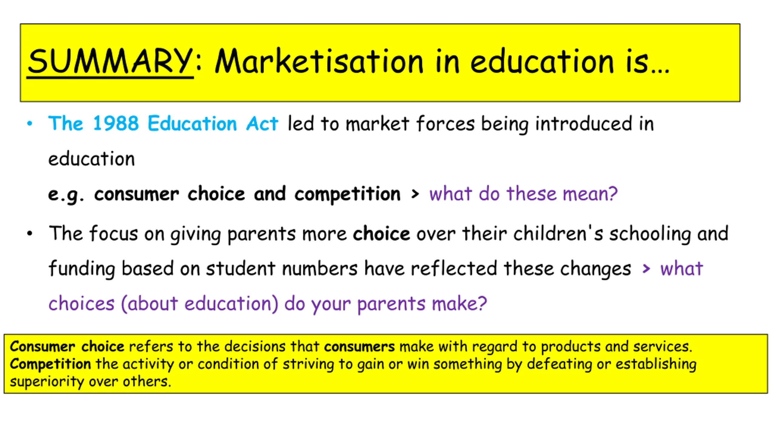 SUMMARY: Marketisation in education is The 1988 Education Act led to market forces being introduced in education e.g. consumer choice and competition > what do these mean? The focus on giving parents more choice over their children's schooling and funding based on student numbers have reflected these changes > what choices (about education) do your parents make? Consumer choice refers to the decisions that consumers make with regard to products and services. Competition the activity or condition of striving to gain or win something by defeating or establishing superiority over others.