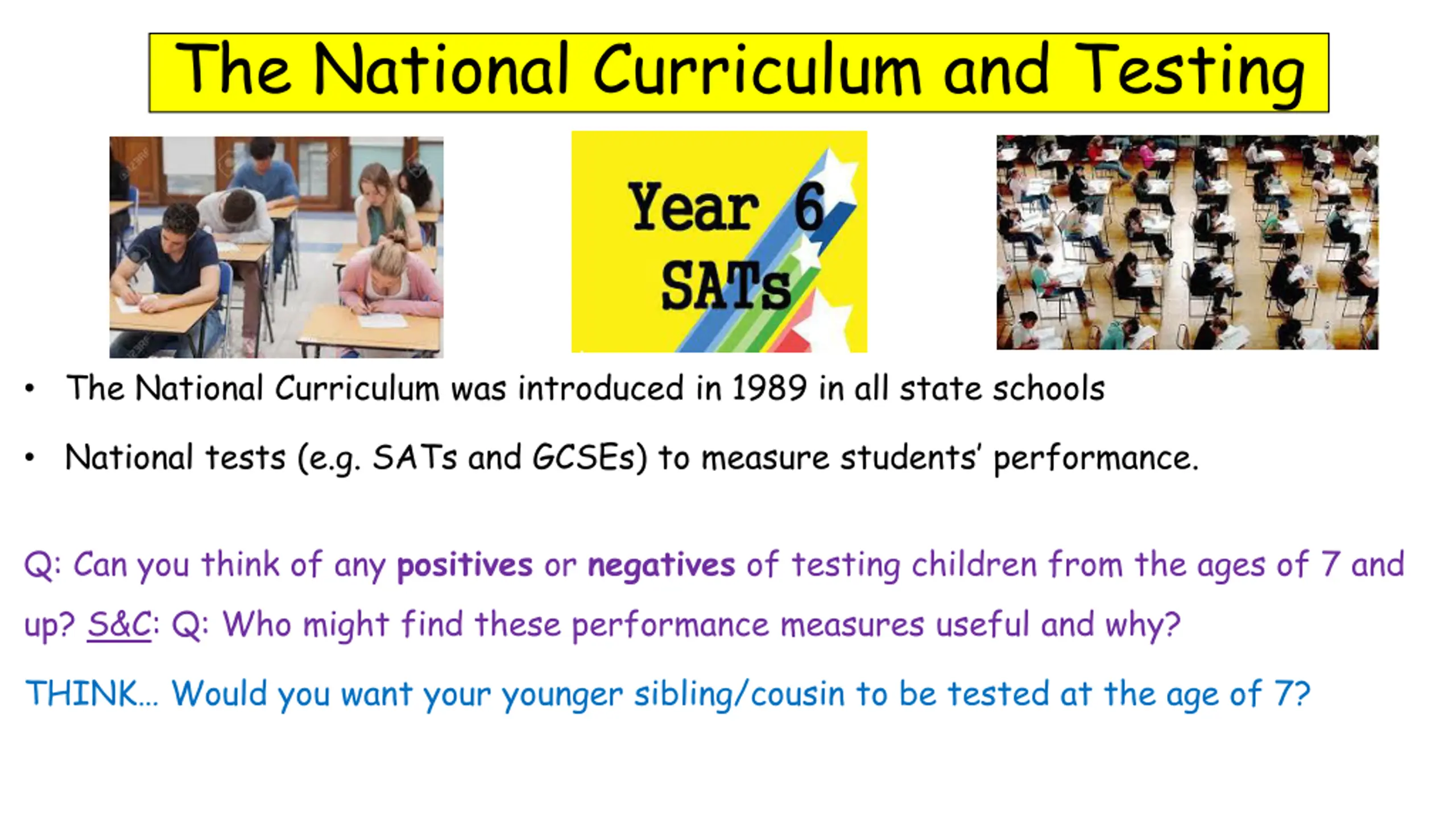 The National Curriculum and Testing The National Curriculum was introduced in 1989 in all state schools National tests (e.g. SATs and GCSEs) to measure students performance. Q: Can you think of any positives or negatives of testing children from the ages of 7 and up? S&C: Q: Who might find these performance measures useful and why? THINK Would you want your younger sibling/cousin to be tested at the age of 7?