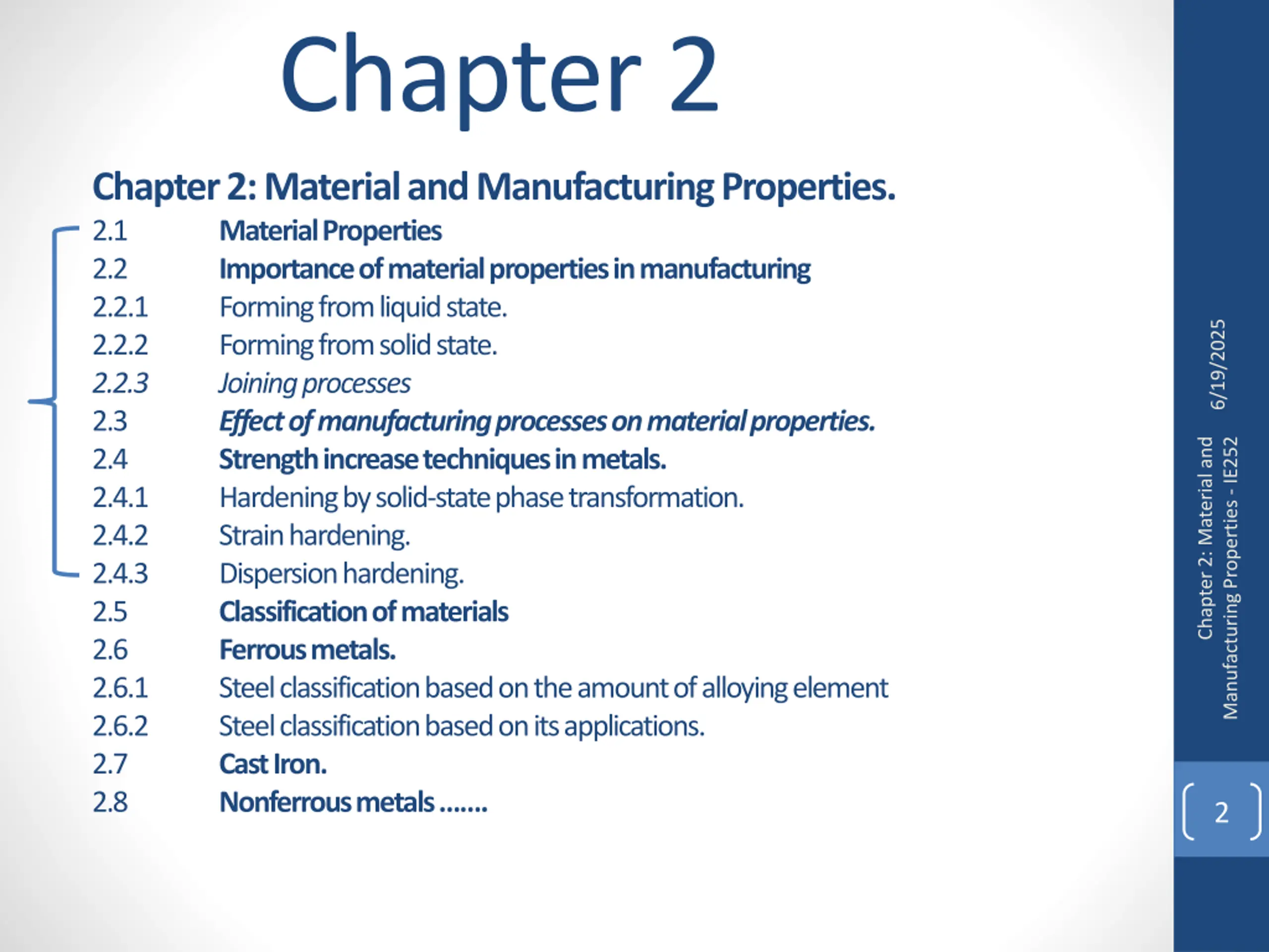 Chapter 2 2.2 Importance of material properties in manufacturing 2.2.1 Forming from liquid state. 2.2.2 Forming from solid state. 2.2.3 Joining processes 2.3 Effect of manufacturing processes on material properties. 2.4 Strength increase techniques in metals. 2.4.1 Hardening by solid-state phase transformation. 2.4.2 Strain hardening. 2.4.3 Dispersion hardening. 2.5 Classification of materials 2.6 Ferrous metals. 2.6.1 Steel classification based on the amount of alloying element 2.6.2 Steel classification based on its applications. 2.7 Cast Iron. 2.8 Nonferrous metals . Chapter 2: Material and Manufacturing Properties. 2.1 Material Properties 6/19/2025 Chapter 2: Material and Manufacturing Properties - IE252 2