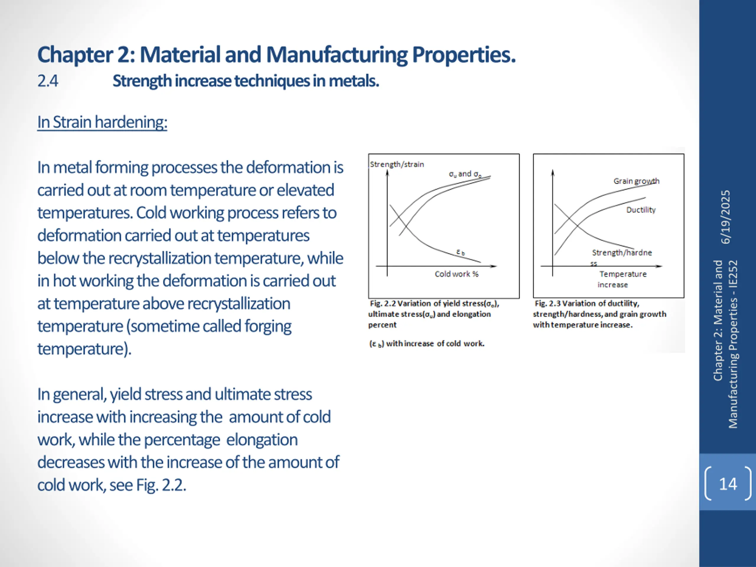 Chapter 2: Material and Manufacturing Properties. 2.4 Strength increase techniques in metals. In Strain hardening: In metal forming processes the deformation is carried out at room temperature or elevated temperatures. Cold working process refers to deformation carried out at temperatures below the recrystallization temperature, while in hot working the deformation is carried out at temperature above recrystallization temperature (sometime called forging temperature). 6/19/2025 Chapter 2: Material and Manufacturing Properties - IE252 In general, yield stress and ultimate stress increase with increasing the amount of cold work, while the percentage elongation decreases with the increase of the amount of cold work, see Fig. 2.2. 14