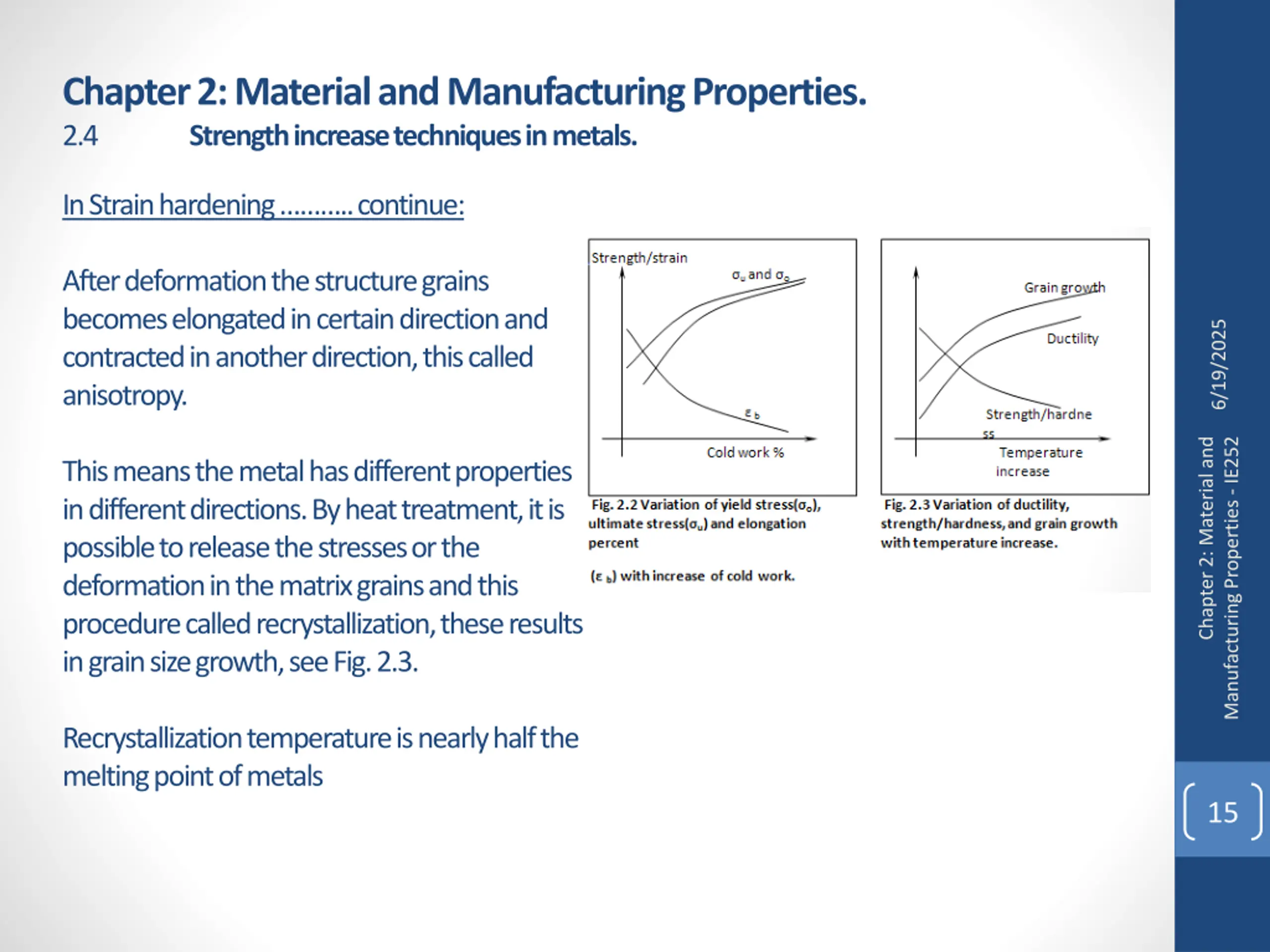 Chapter 2: Material and Manufacturing Properties. 2.4 Strength increase techniques in metals. In Strain hardening .. continue: After deformation the structure grains becomes elongated in certain direction and contracted in another direction, this called anisotropy. 6/19/2025 Chapter 2: Material and Manufacturing Properties - IE252 This means the metal has different properties in different directions. By heat treatment, it is possible to release the stresses or the deformation in the matrix grains and this procedure called recrystallization, these results in grain size growth, see Fig. 2.3. Recrystallization temperature is nearly half the melting point of metals 15
