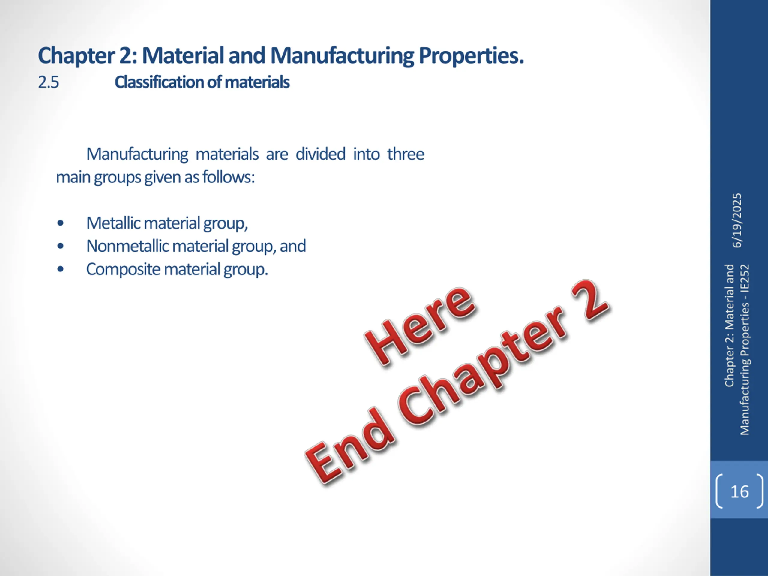 Chapter 2: Material and Manufacturing Properties. 2.5 Classification of materials Manufacturing materials are divided into three main groups given as follows: 6/19/2025 Metallic material group, Nonmetallic material group, and Composite material group. Chapter 2: Material and Manufacturing Properties - IE252 16