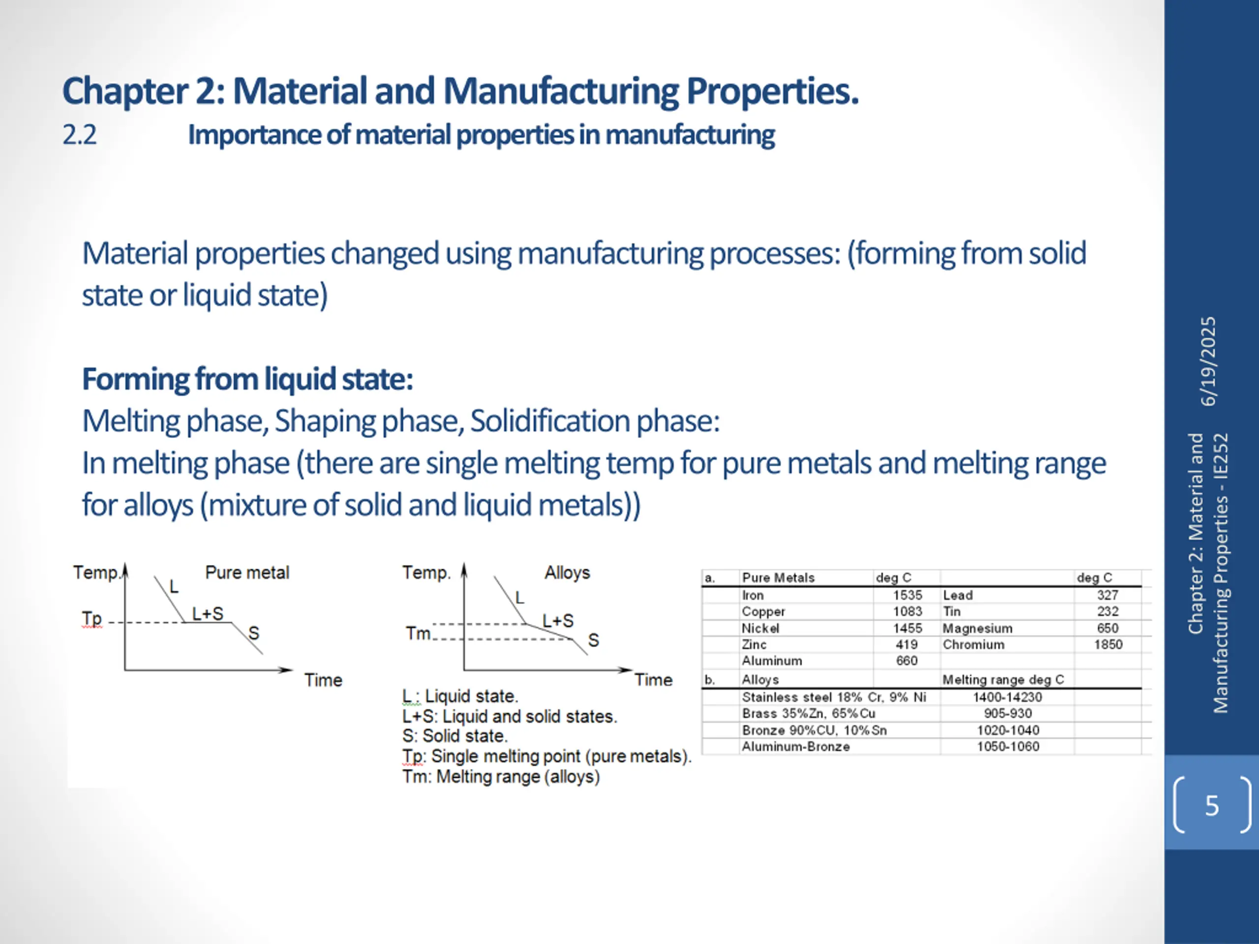 Chapter 2: Material and Manufacturing Properties. 2.2 Importance of material properties in manufacturing Material properties changed using manufacturing processes: (forming from solid state or liquid state) 6/19/2025 Forming from liquid state: Melting phase, Shaping phase, Solidification phase: In melting phase (there are single melting temp for pure metals and melting range for alloys (mixture of solid and liquid metals)) Chapter 2: Material and Manufacturing Properties - IE252 5
