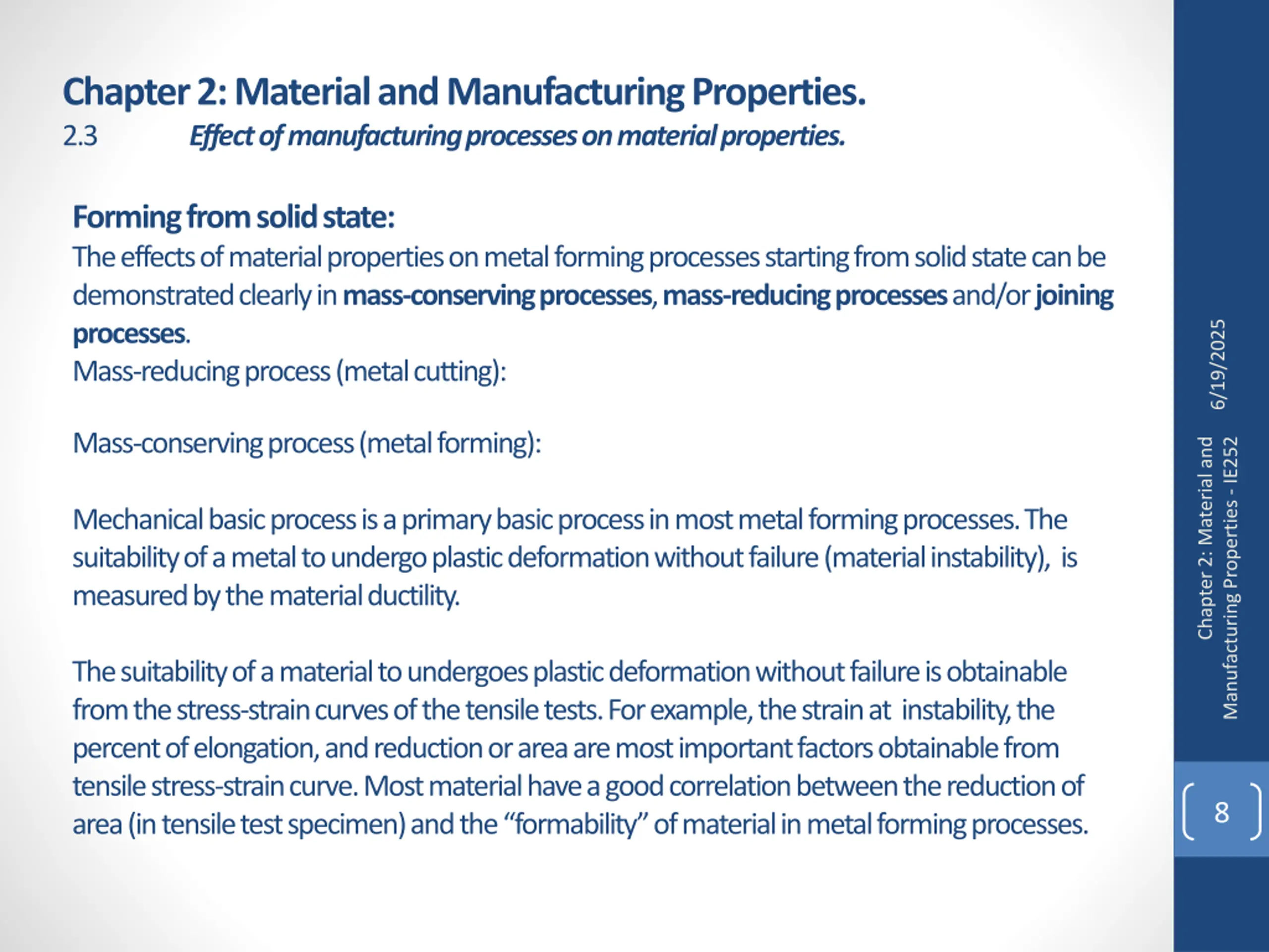 Chapter 2: Material and Manufacturing Properties. 2.3 Effect of manufacturing processes on material properties. Forming from solid state: The effects of material properties on metal forming processes starting from solid state can be demonstrated clearly in mass-conserving processes, mass-reducing processes and/or joining processes. Mass-reducing process (metal cutting): 6/19/2025 Mass-conserving process (metal forming): Chapter 2: Material and Manufacturing Properties - IE252 Mechanical basic process is a primary basic process in most metal forming processes. The suitability of a metal to undergo plastic deformation without failure (material instability), is measured by the material ductility. The suitability of a material to undergoes plastic deformation without failure is obtainable from the stress-strain curves of the tensile tests. For example, the strain at instability, the percent of elongation, and reduction or area are most important factors obtainable from tensile stress-strain curve. Most material have a good correlation between the reduction of area (in tensile test specimen) and the formability of material in metal forming processes. 8