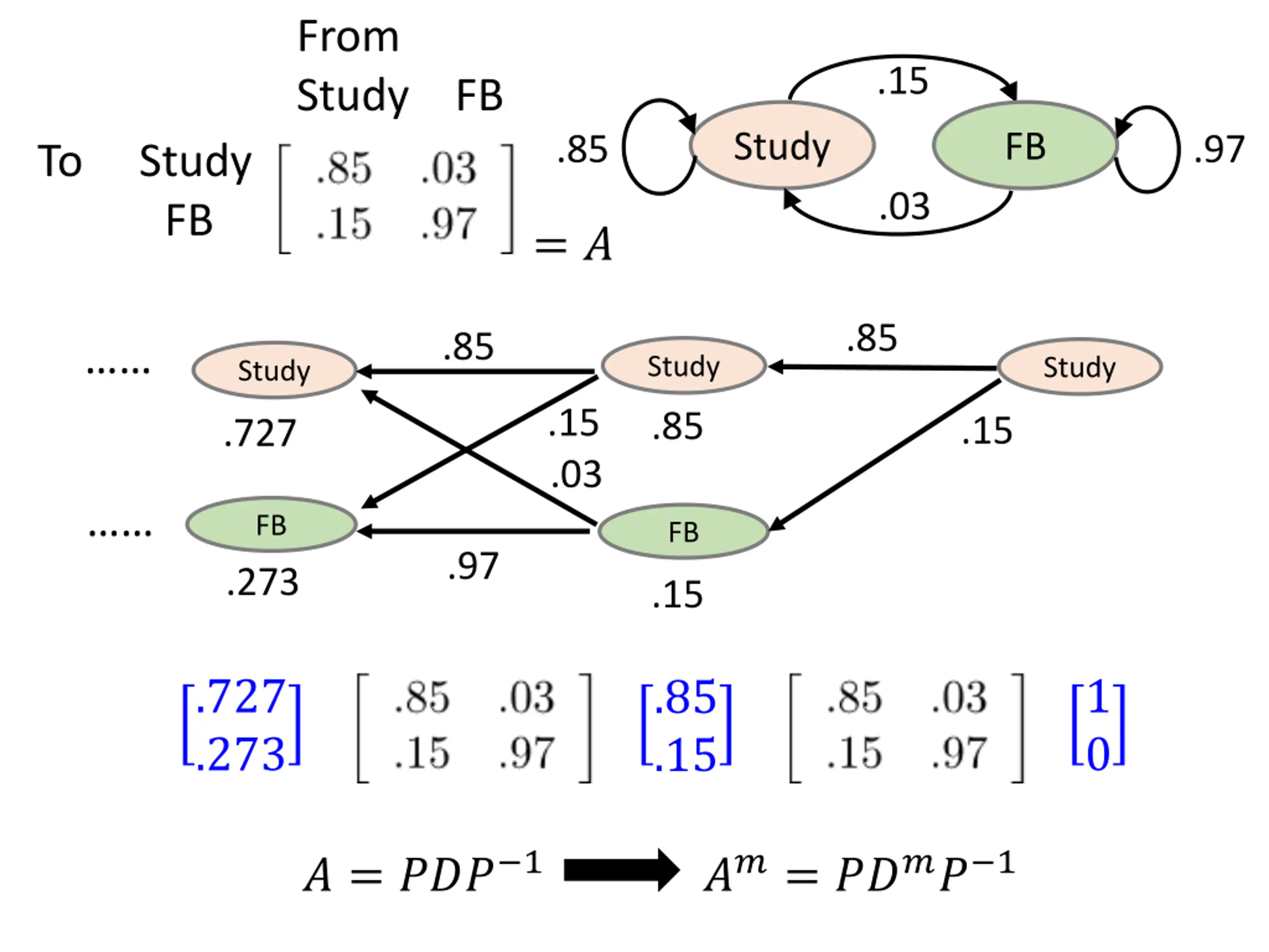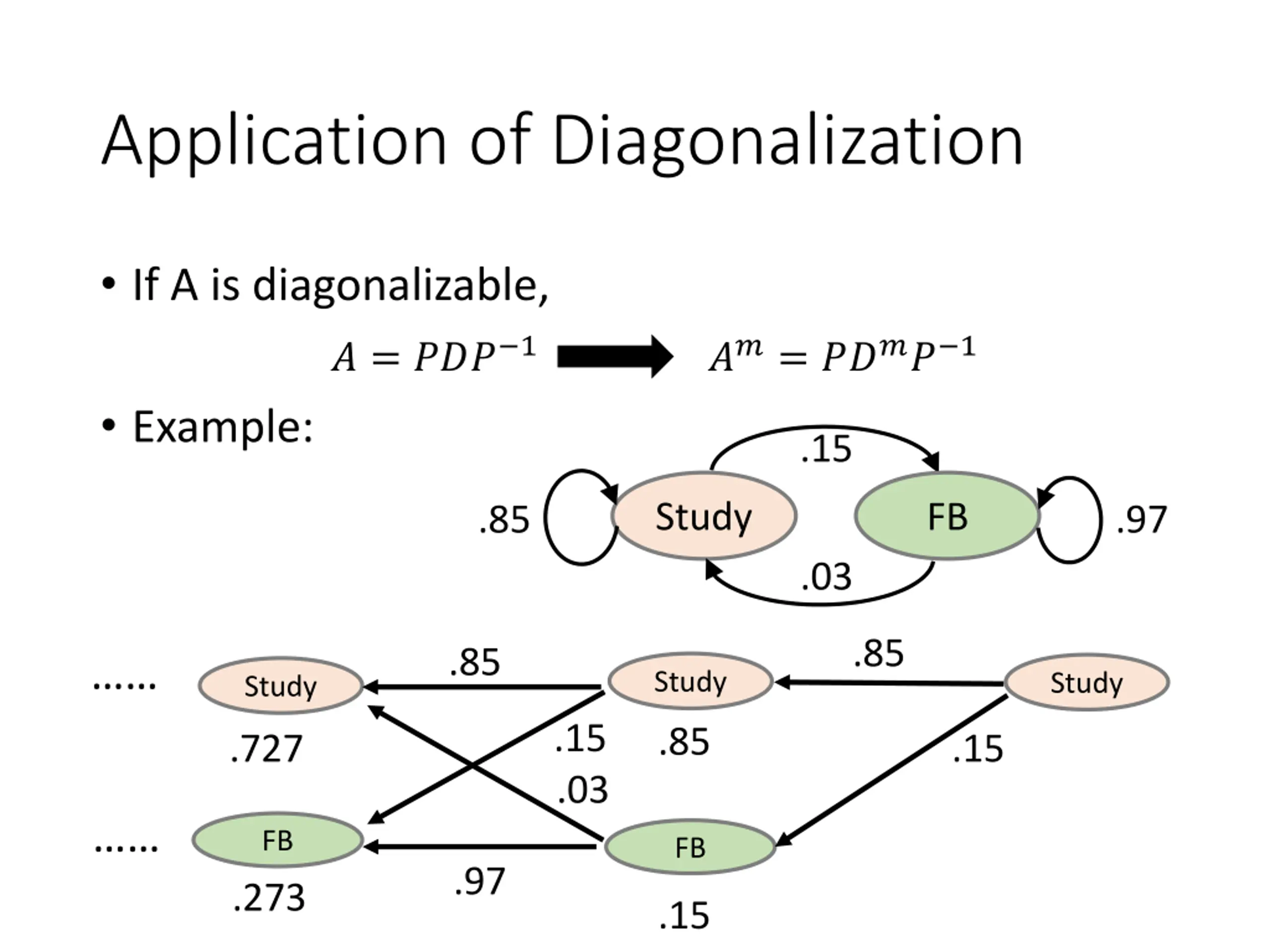 Application of Diagonalization If A is diagonalizable, ? = ??? 1 ??= ???? 1 Example: .15 Study FB .85 .97 .03 .85 .85 Study Study Study .15 .03 .85 .727 .15 FB FB .97 .273 .15