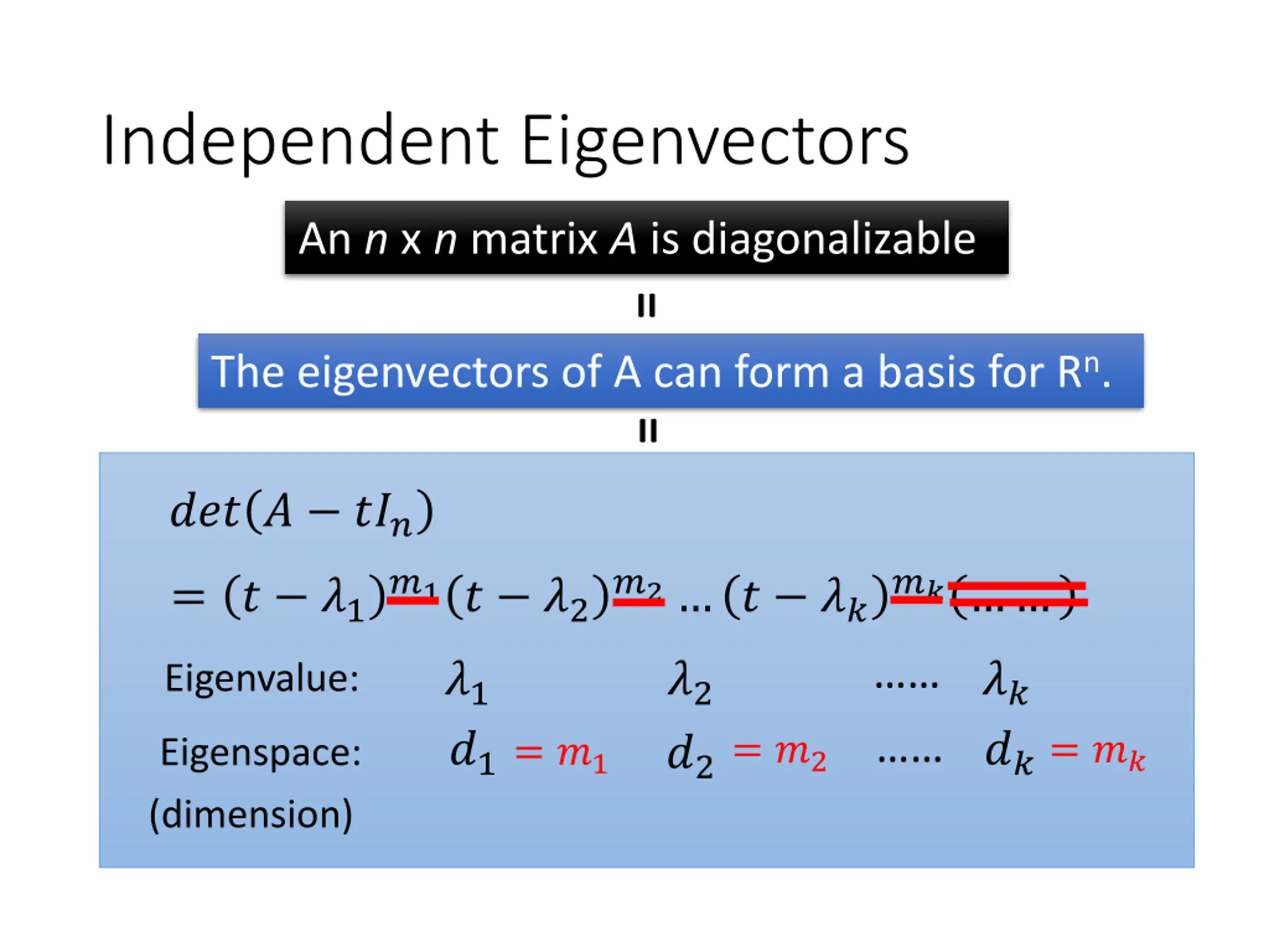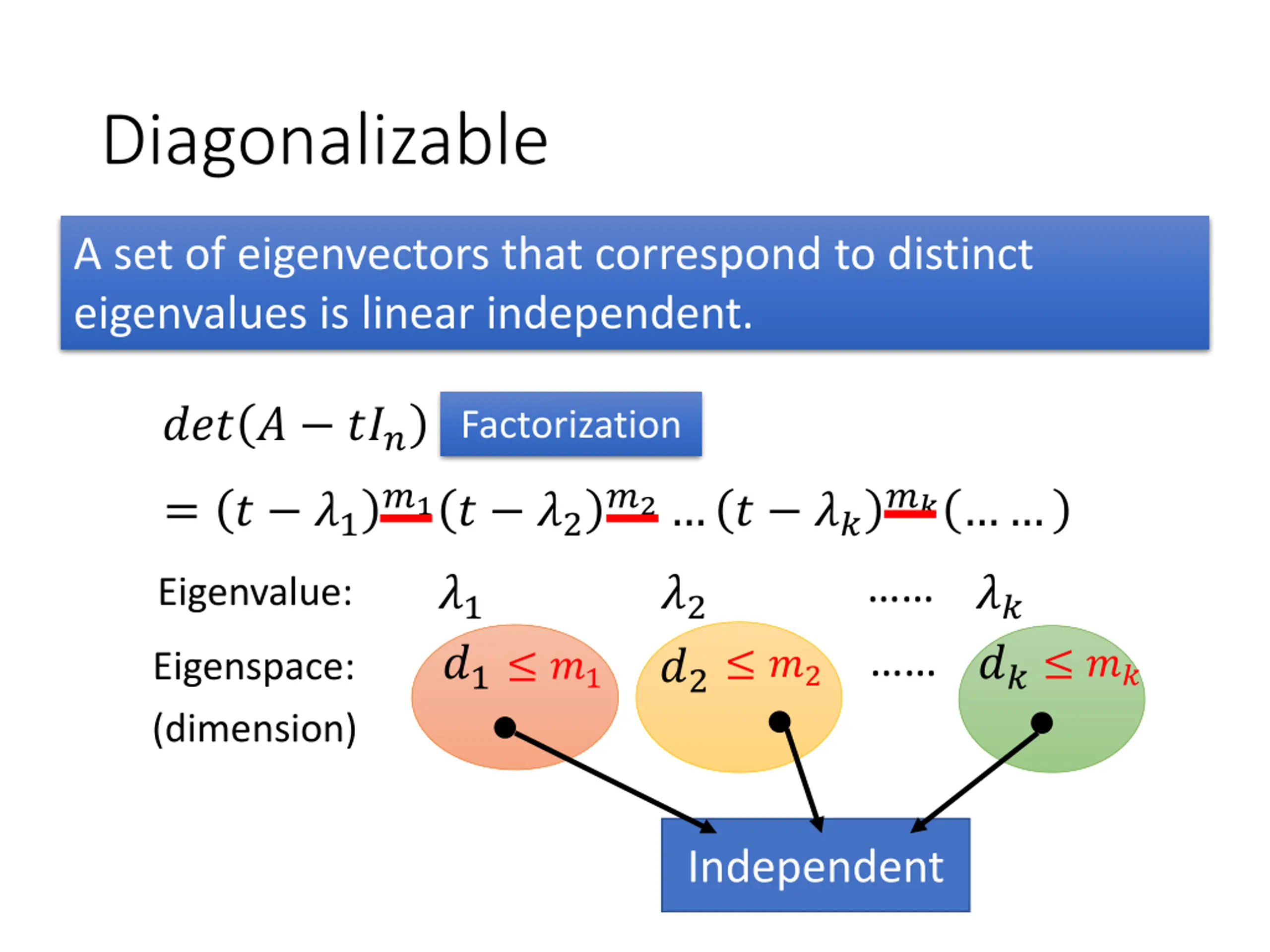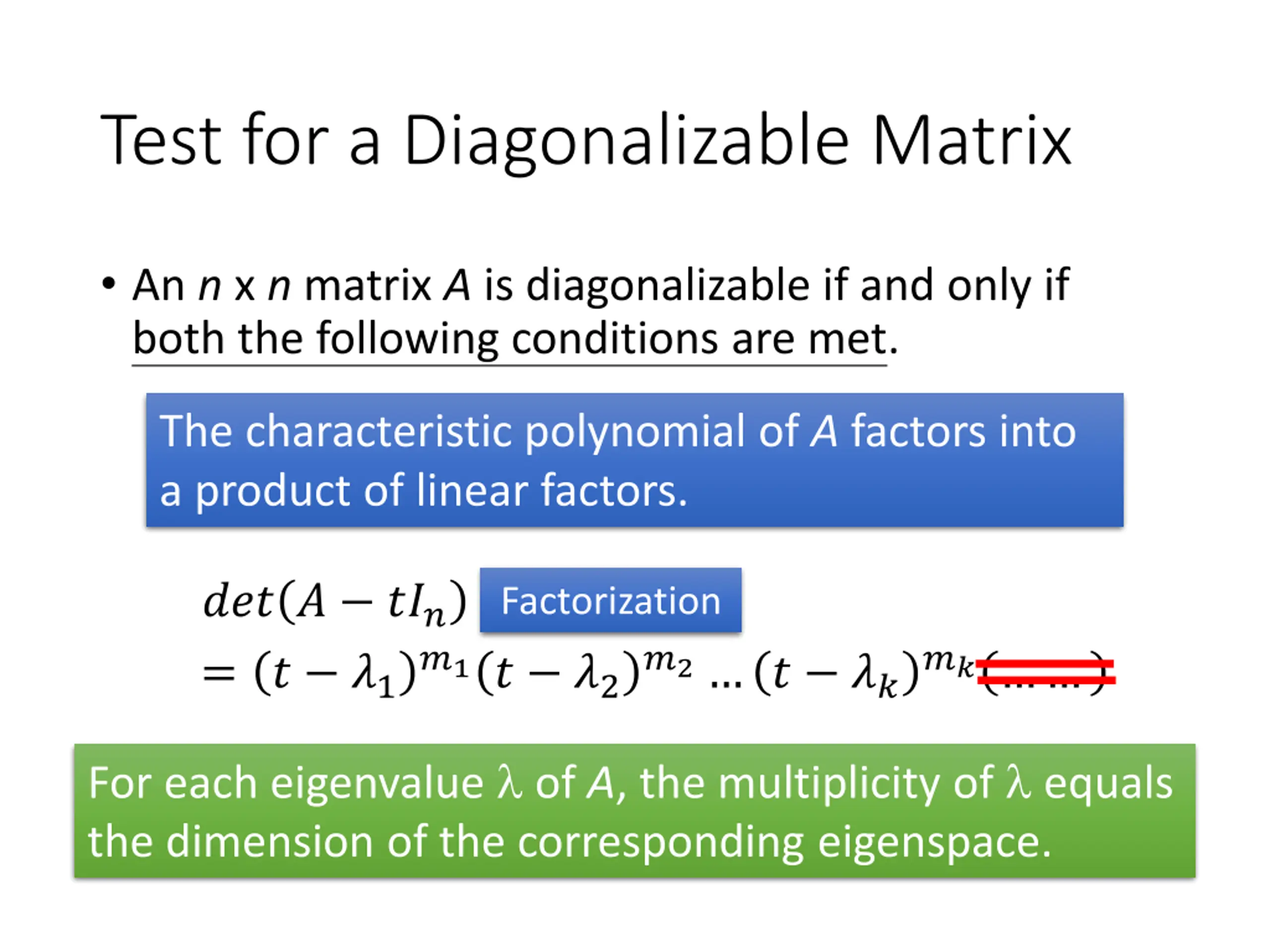 Test for a Diagonalizable Matrix An n x n matrix A is diagonalizable if and only if both the following conditions are met. The characteristic polynomial of A factors into a product of linear factors. ??? ? ??? = ? ?1 Factorization ?1? ?2 ?2 ? ?? ?? For each eigenvalue of A, the multiplicity of equals the dimension of the corresponding eigenspace.