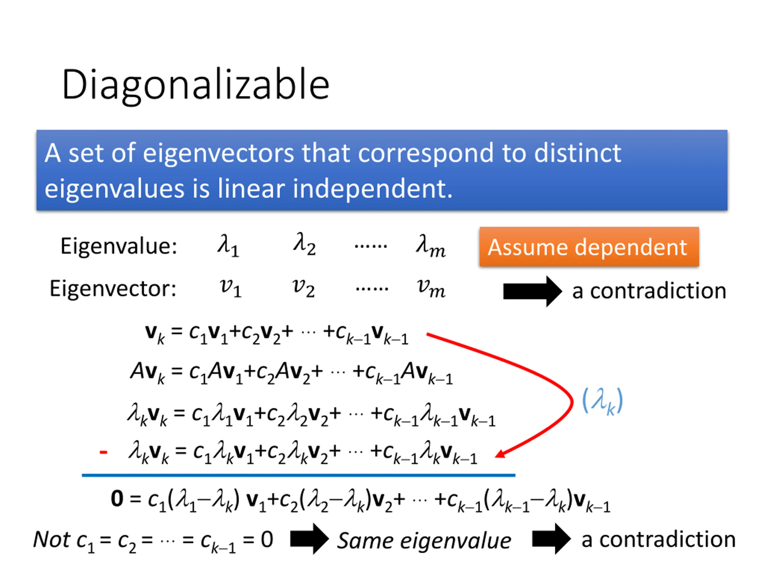 Diagonalizable A set of eigenvectors that correspond to distinct eigenvalues is linear independent. ?2 ?1 ?1 ?? ?? Eigenvalue: Assume dependent ?2 Eigenvector: a contradiction vk= c1v1+c2v2+ +ck 1vk 1 Avk= c1Av1+c2Av2+ +ck 1Avk 1 kvk= c1 1v1+c2 2v2+ +ck 1 k 1vk 1 kvk= c1 kv1+c2 kv2+ +ck 1 kvk 1 0 = c1( 1 k) v1+c2( 2 k)v2+ +ck 1( k 1 k)vk 1 Not c1 = c2 = = ck 1= 0 ( k) - a contradiction Same eigenvalue