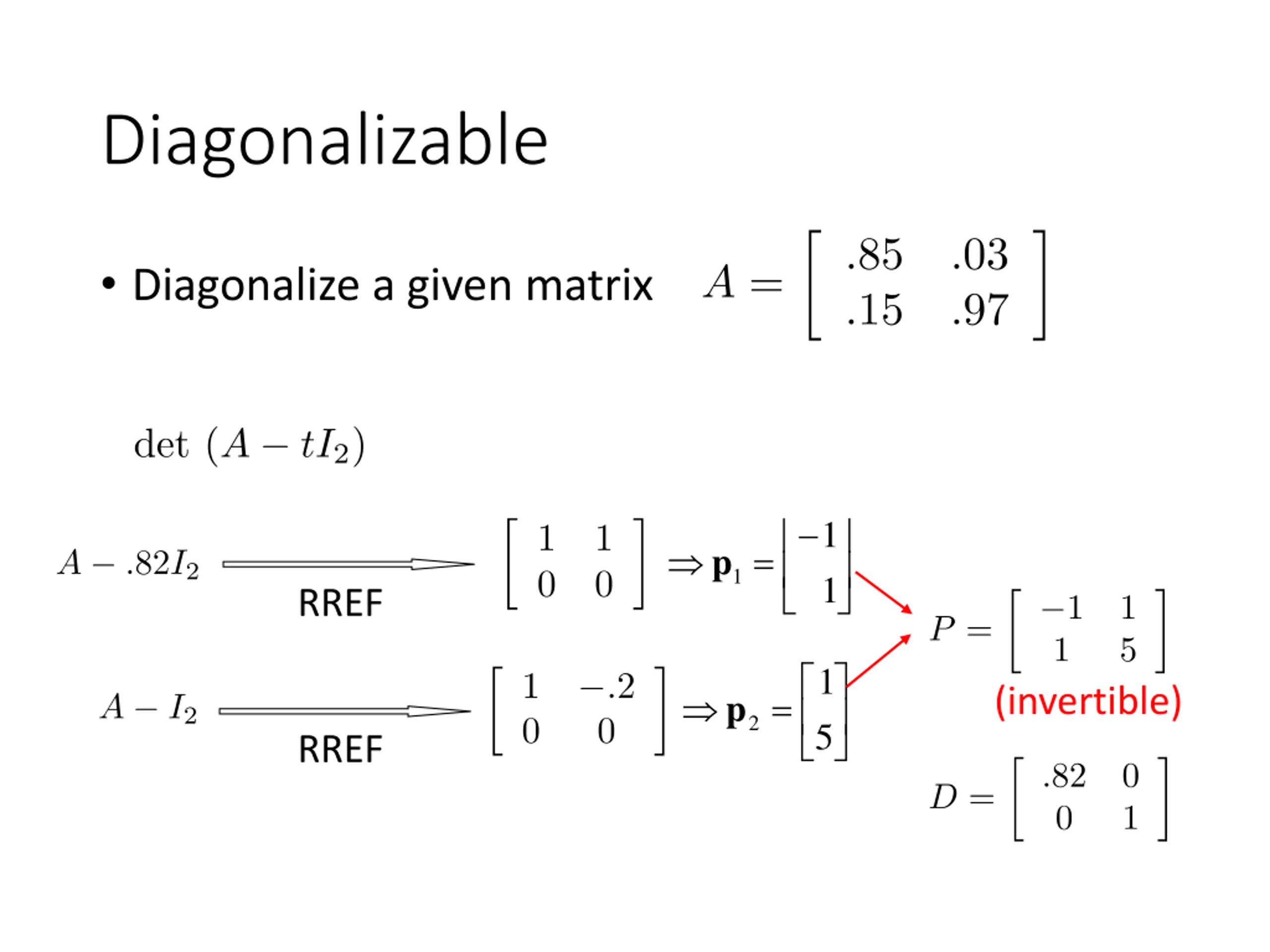 Diagonalizable Diagonalize a given matrix 1 = 1 p 1 RREF 1 (invertible) = p 2 5 RREF