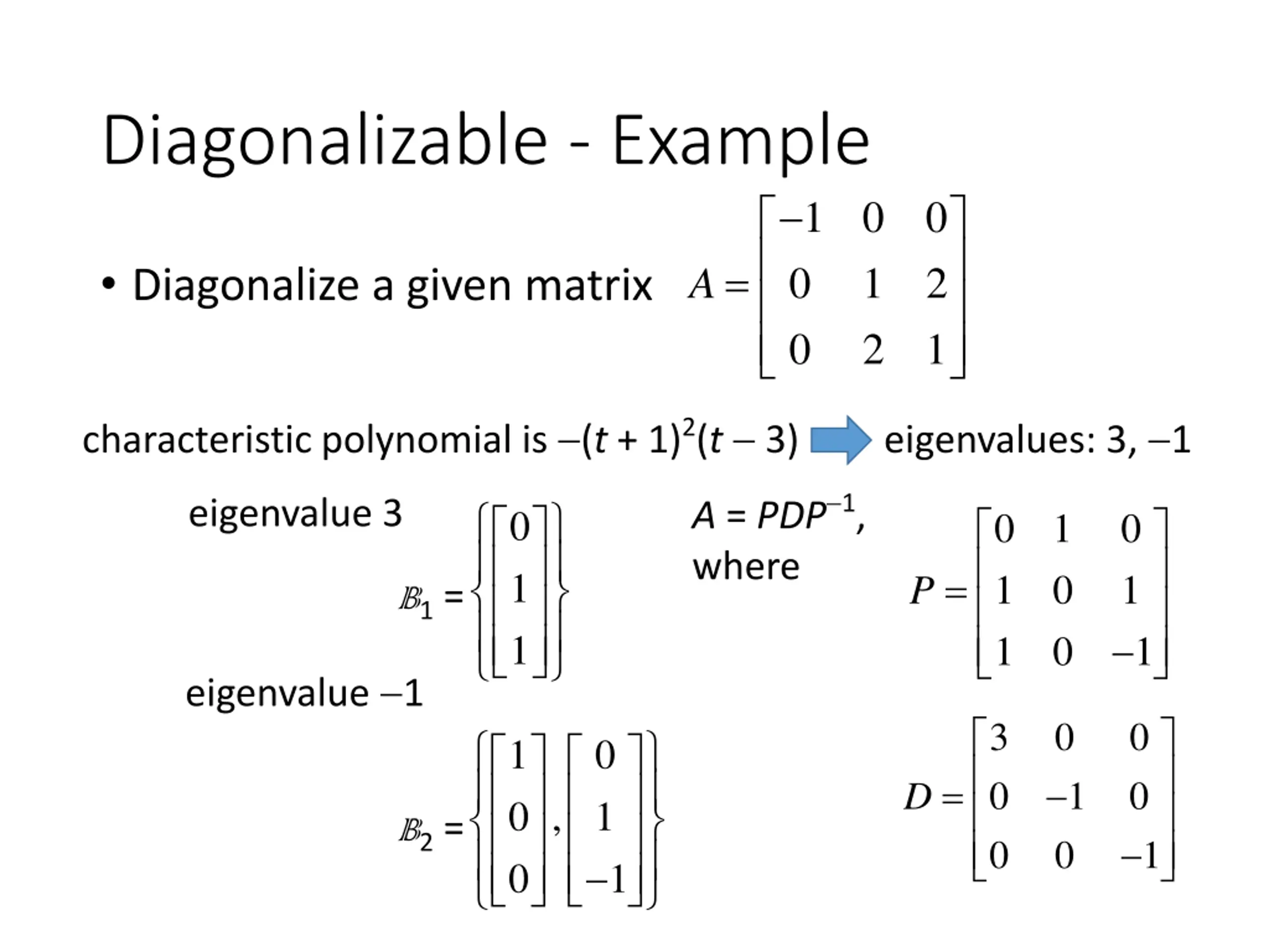 Diagonalizable - Example 1 0 0 0 0 2 1 = Diagonalize a given matrix 1 2 A characteristic polynomial is (t + 1)2(t 3) eigenvalues: 3, 1 A = PDP 1, where eigenvalue 3 0 1 1 0 1 1 1 0 0 0 1 = P B1= 1 eigenvalue 1 3 0 0 0 0 0 1 0 , 1 0 0 = 1 D B2= 0 1 1