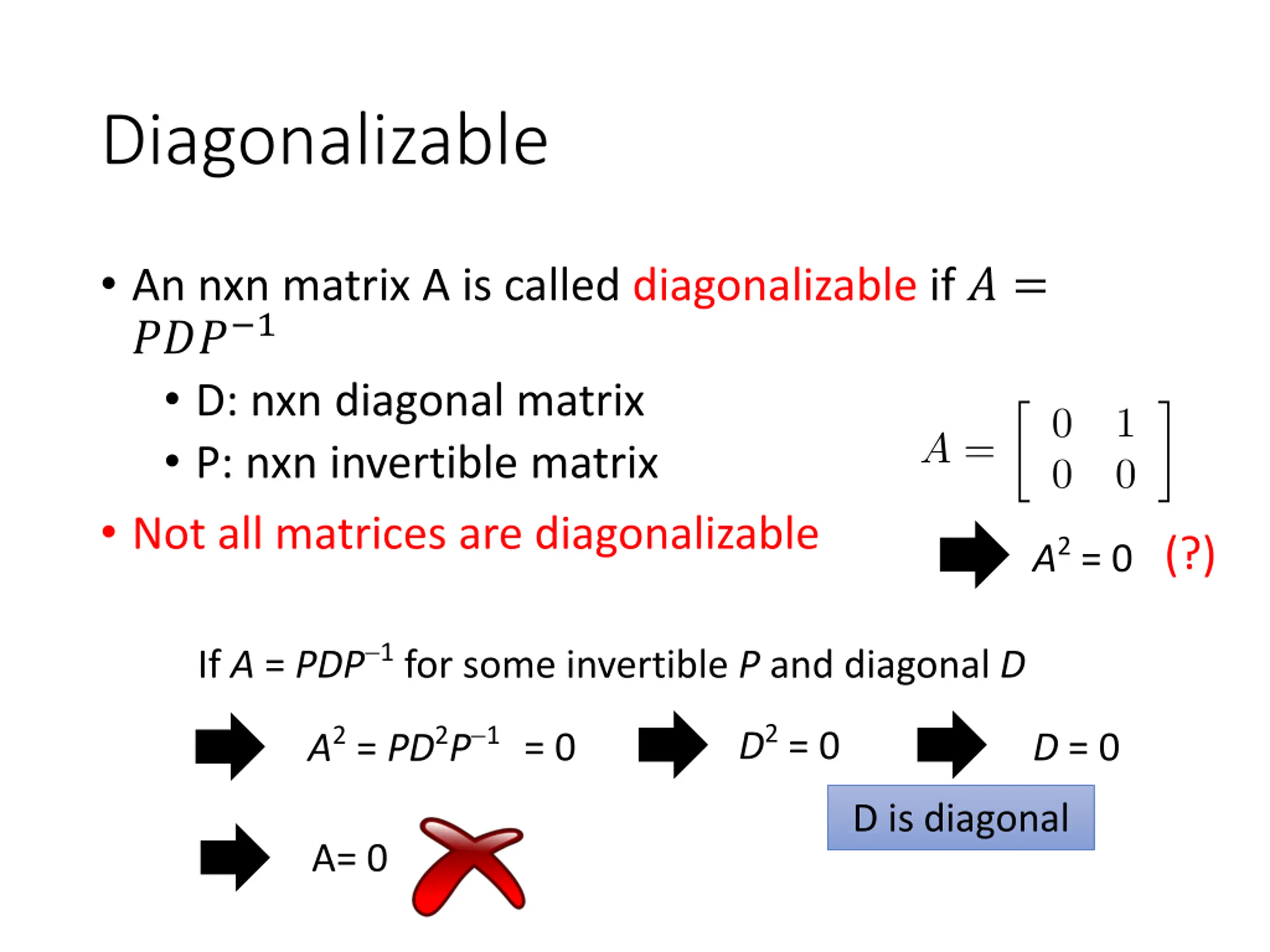 Diagonalizable An nxn matrix A is called diagonalizable if ? = ??? 1 D: nxn diagonal matrix P: nxn invertible matrix Not all matrices are diagonalizable (?) A2= 0 If A = PDP 1for some invertible P and diagonal D A2= PD2P 1= 0 D2= 0 D = 0 D is diagonal A= 0