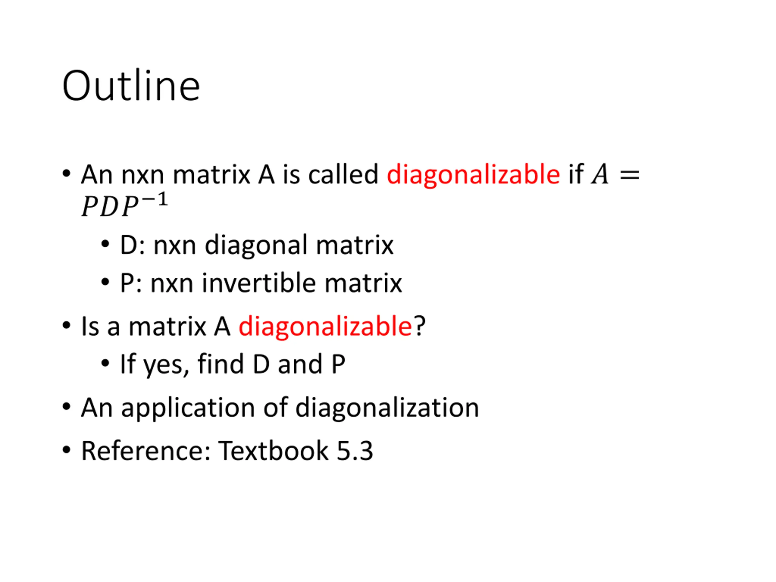 Outline An nxn matrix A is called diagonalizable if ? = ??? 1 D: nxn diagonal matrix P: nxn invertible matrix Is a matrix A diagonalizable? If yes, find D and P An application of diagonalization Reference: Textbook 5.3