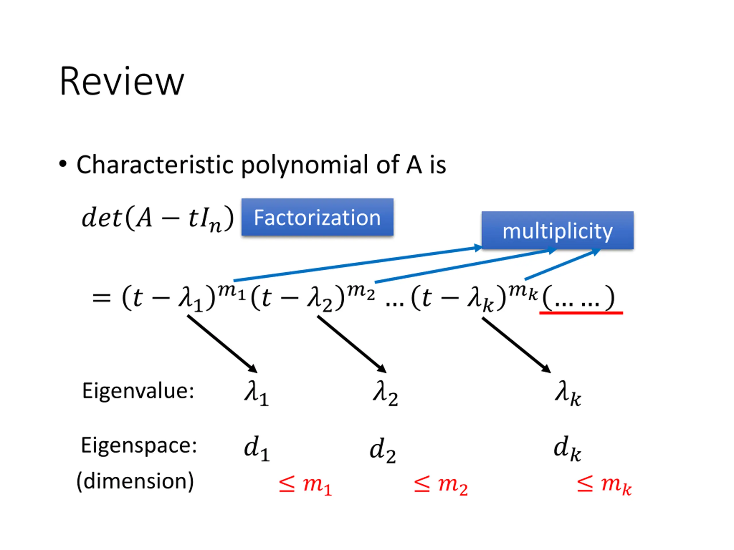 Review Characteristic polynomial of A is ??? ? ??? Factorization multiplicity ?1? ?2 ?2 ? ?? ?? = ? ?1 ?1 ?2 ?? Eigenvalue: ?1 ?? Eigenspace: (dimension) ?2 ?? ?1 ?2