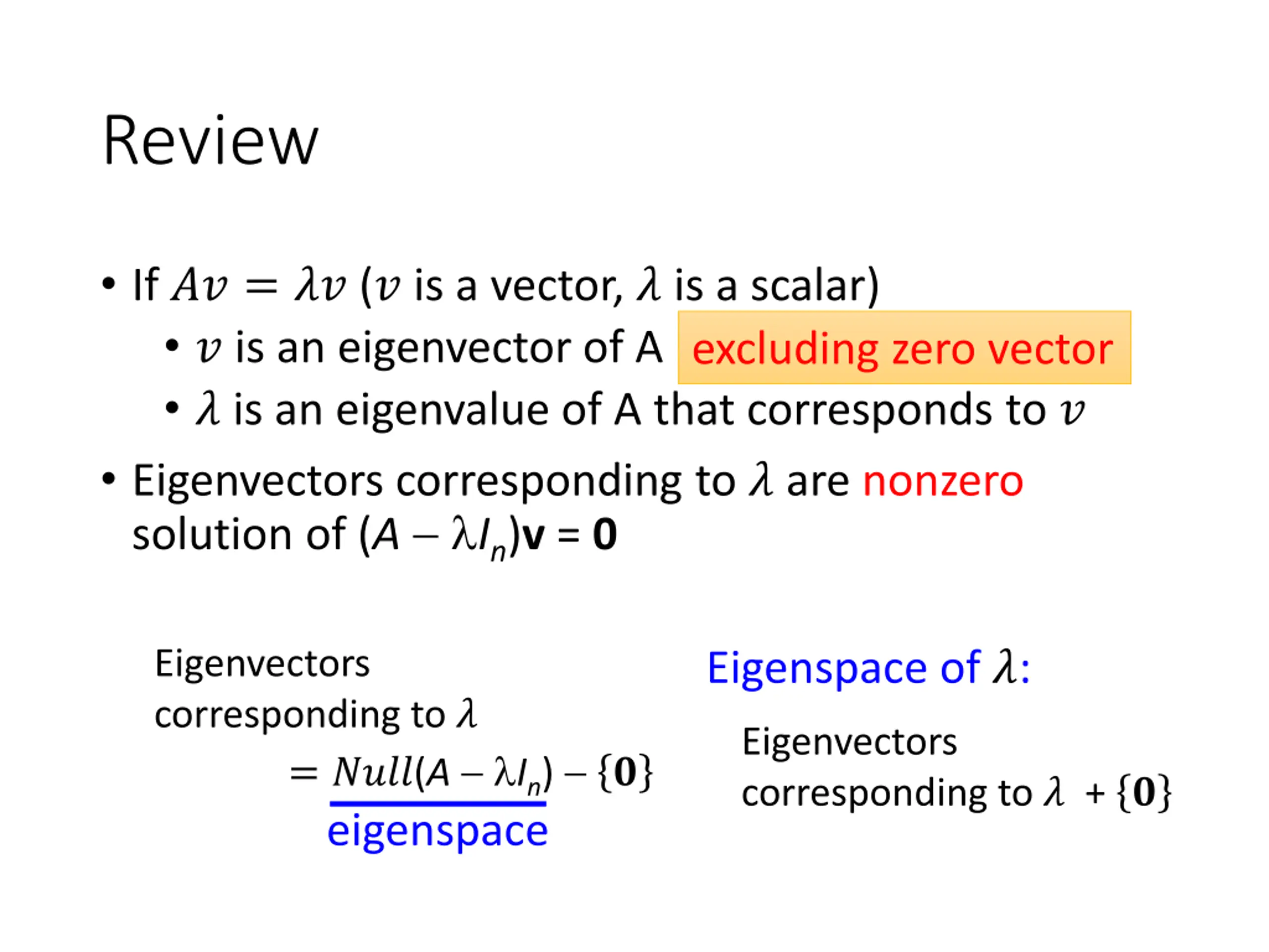 Review If ?? = ?? (? is a vector, ? is a scalar) ? is an eigenvector of A ? is an eigenvalue of A that corresponds to ? Eigenvectors corresponding to ? are nonzero solution of (A In)v = 0 excluding zero vector Eigenvectors corresponding to ? = ????(A In) ? eigenspace Eigenspace of ?: Eigenvectors corresponding to ? + ?