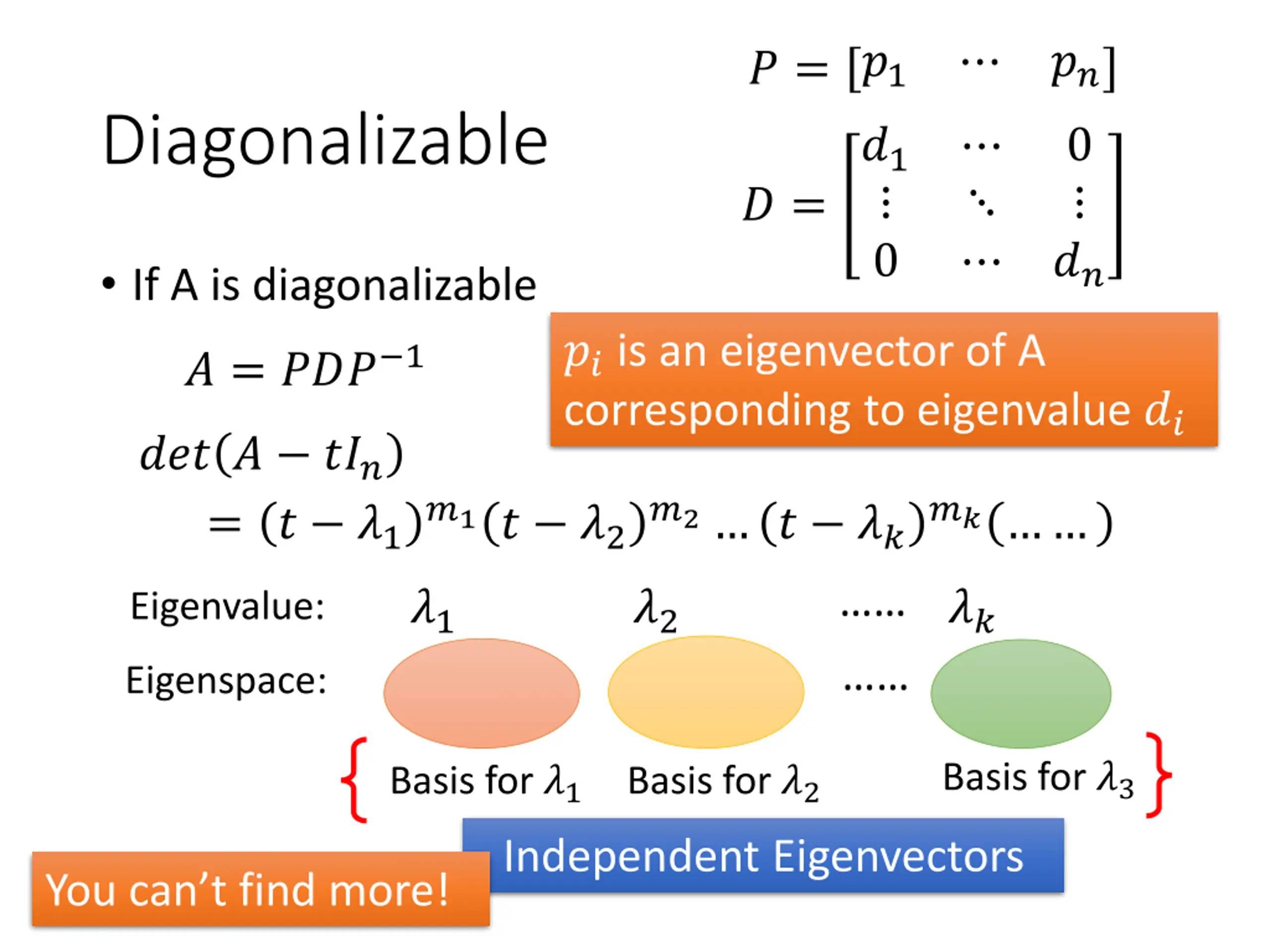 ? = ?1 ?? Diagonalizable ?1 0 0 ? = ?? If A is diagonalizable ?? is an eigenvector of A corresponding to eigenvalue ?? ? = ??? 1 ??? ? ??? = ? ?1 ?1? ?2 ?2 ? ?? ?? ?1 ?2 ?? Eigenvalue: Eigenspace: Basis for ?3 Basis for ?1 Basis for ?2 Independent Eigenvectors You can t find more!