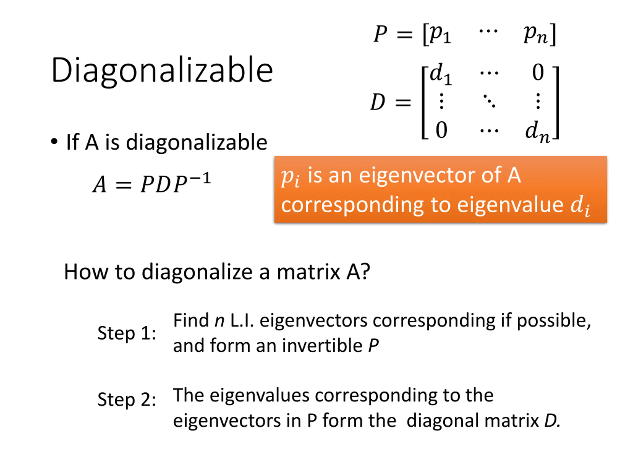 ? = ?1 ?? Diagonalizable ?1 0 0 ? = ?? If A is diagonalizable ?? is an eigenvector of A corresponding to eigenvalue ?? ? = ??? 1 How to diagonalize a matrix A? Find n L.I. eigenvectors corresponding if possible, and form an invertible P Step 1: The eigenvalues corresponding to the eigenvectors in P form the diagonal matrix D. Step 2: