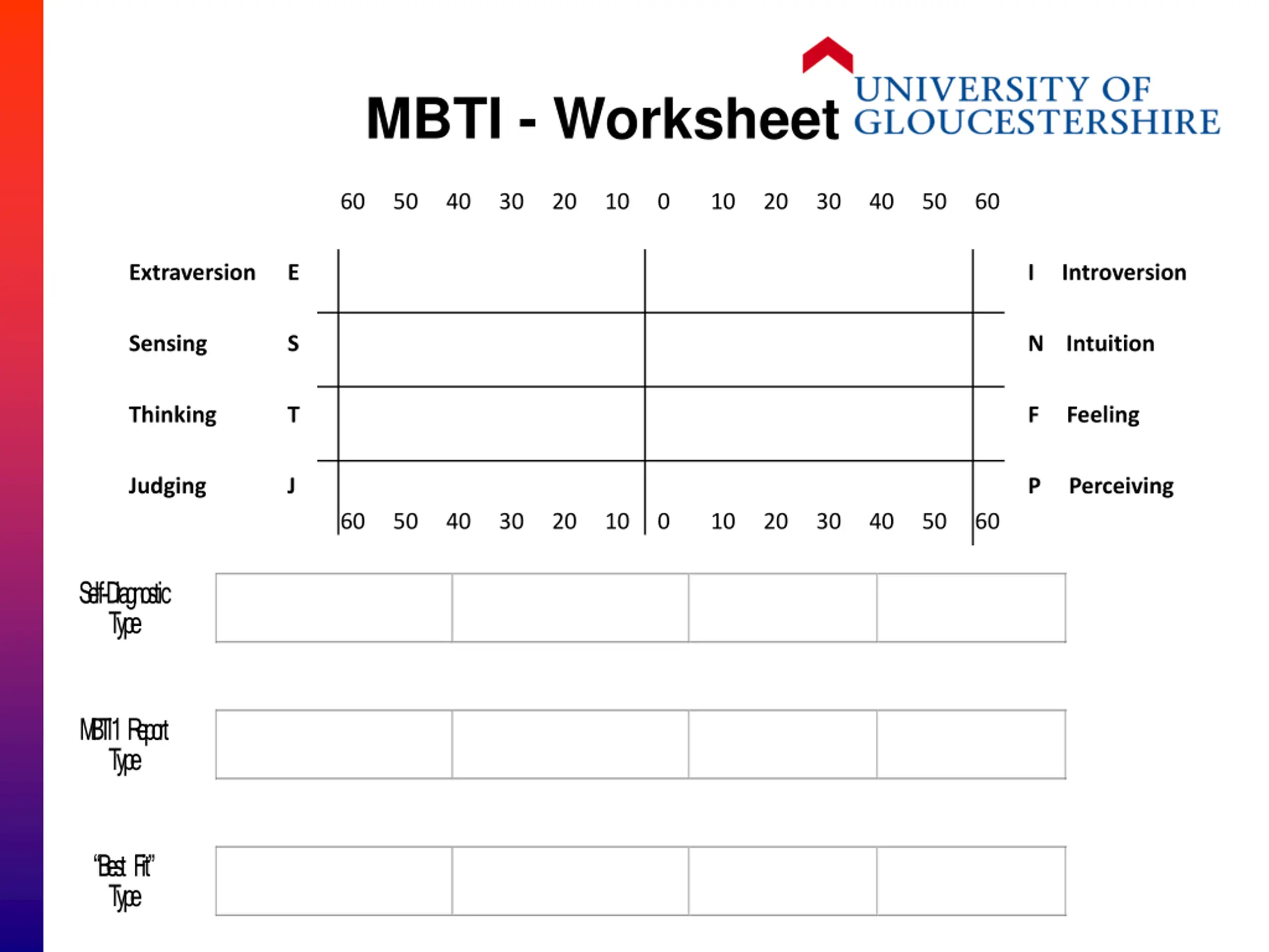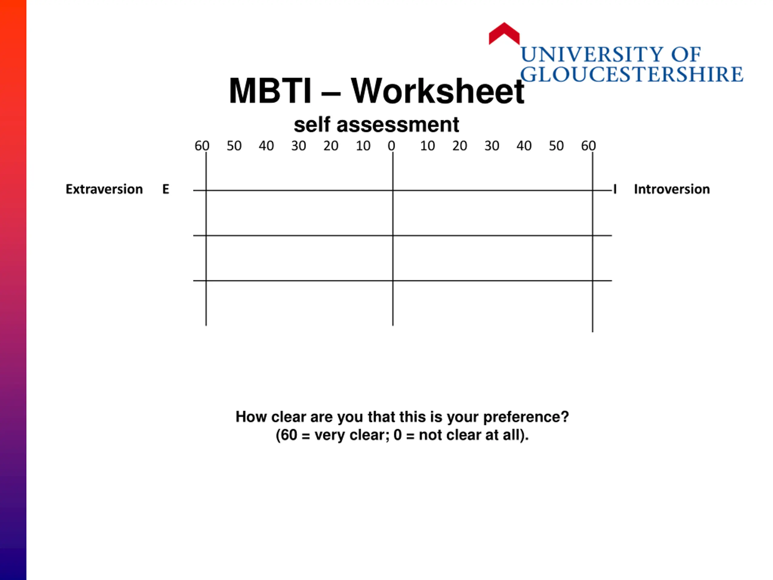MBTI Worksheet self assessment 50 40 30 20 10 60 0 10 20 30 40 50 60 Extraversion E I Introversion How clear are you that this is your preference? (60 = very clear; 0 = not clear at all).