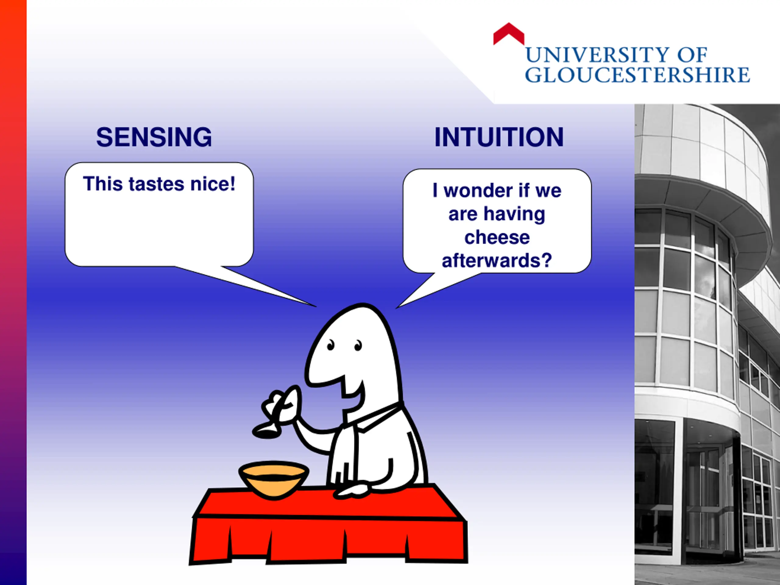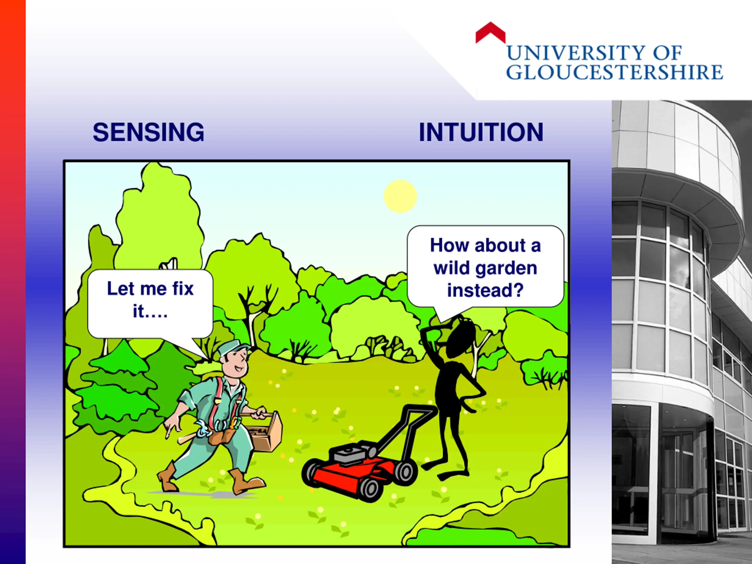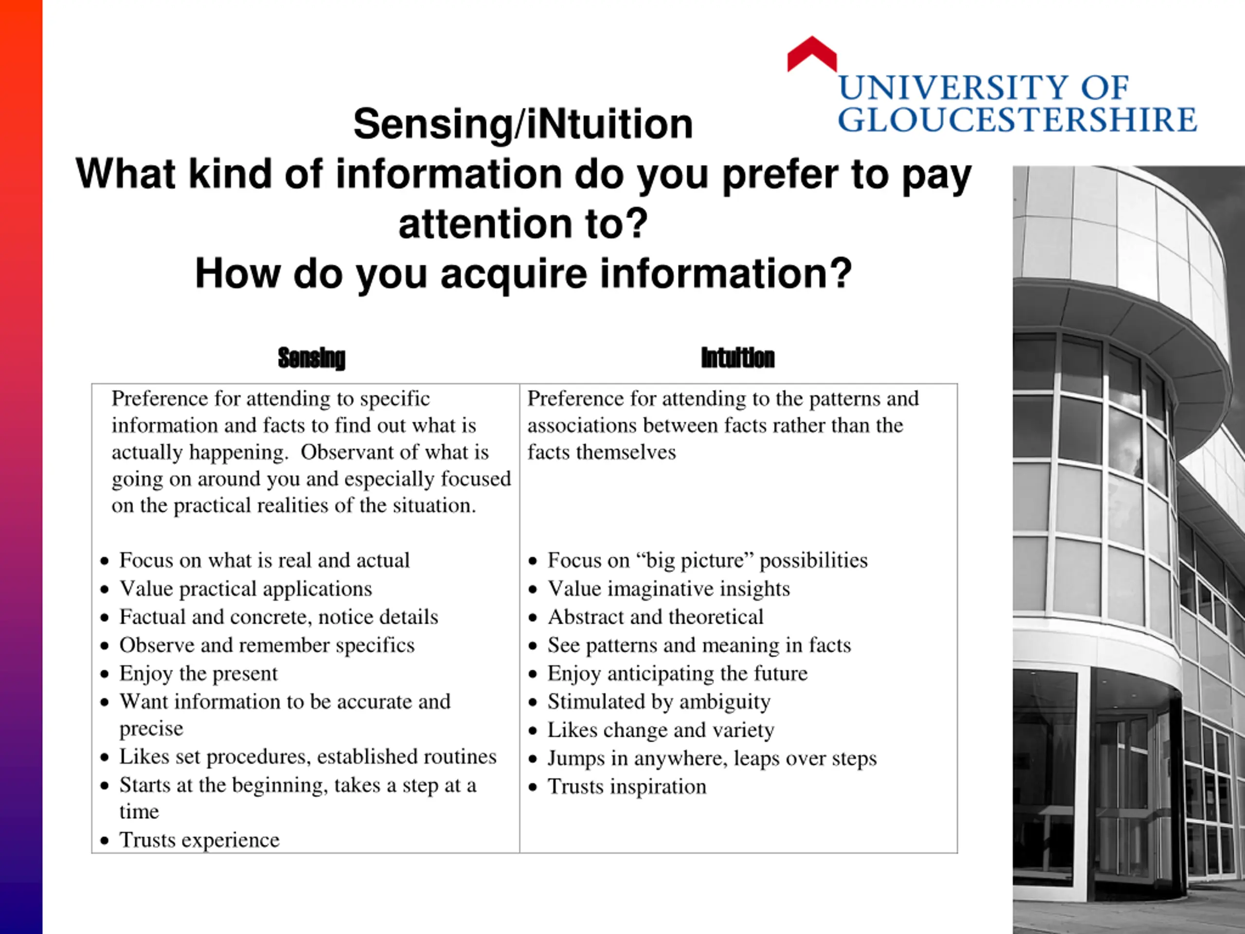 Sensing/iNtuition What kind of information do you prefer to pay attention to? How do you acquire information? Intuition Intuition Sensing Sensing Preference for attending to specific information and facts to find out what is actually happening. Observant of what is going on around you and especially focused on the practical realities of the situation. Preference for attending to the patterns and associations between facts rather than the facts themselves Focus on big picture possibilities Value imaginative insights Abstract and theoretical See patterns and meaning in facts Enjoy anticipating the future Stimulated by ambiguity Likes change and variety Jumps in anywhere, leaps over steps Trusts inspiration Focus on what is real and actual Value practical applications Factual and concrete, notice details Observe and remember specifics Enjoy the present Want information to be accurate and precise Likes set procedures, established routines Starts at the beginning, takes a step at a time Trusts experience
