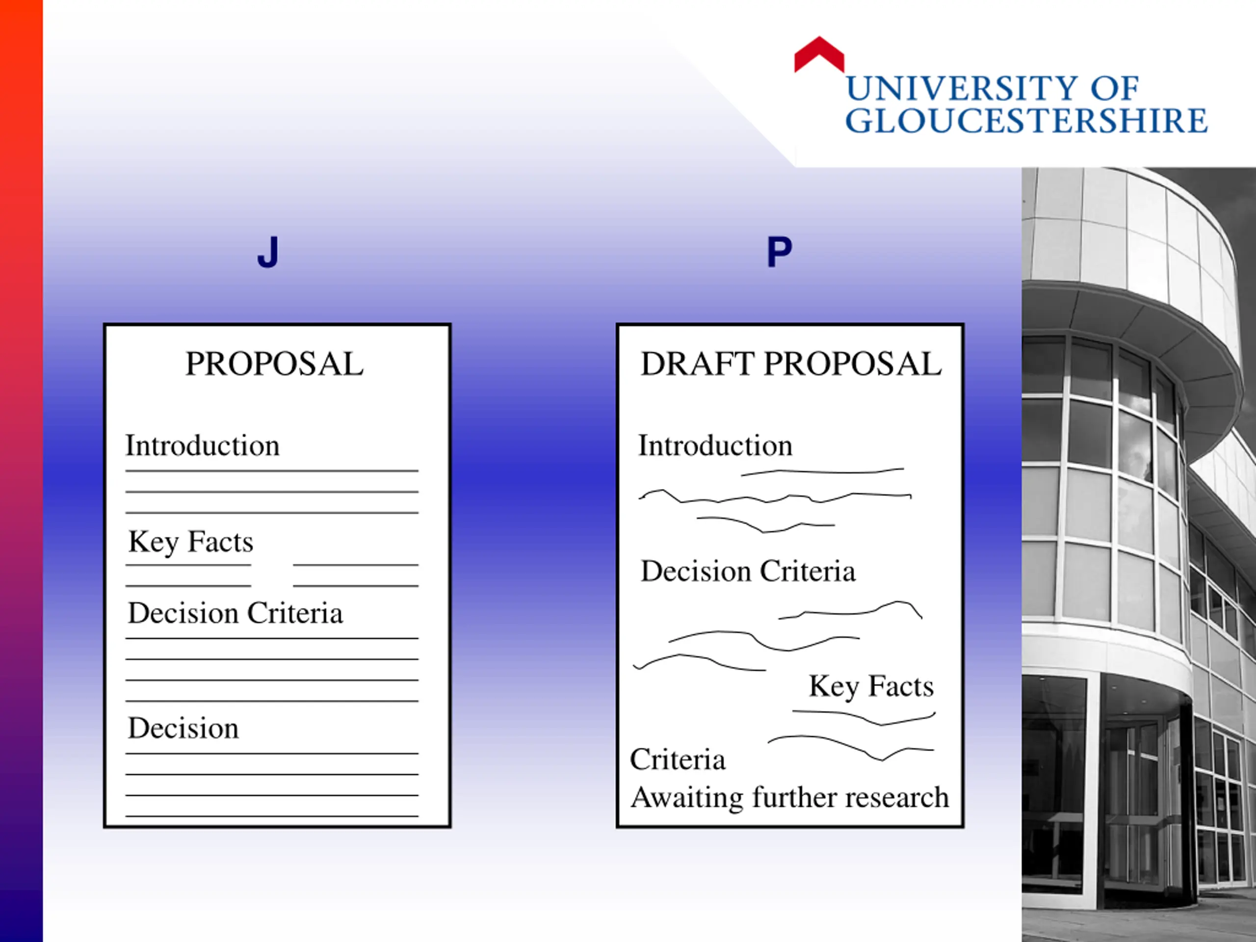 SOME KEY WORDS J P (Judgment) (Perception) ORGANISED FLEXIBLE STRUCTURE FLOW CONTROL DECISIVE DELIBERATE CLOSURE PLAN DEADLINES PRODUCTIVE EXPERIENCE CURIOUS SPONTANEOUS OPENNESS WAIT DISCOVERIES RECEPTIVE