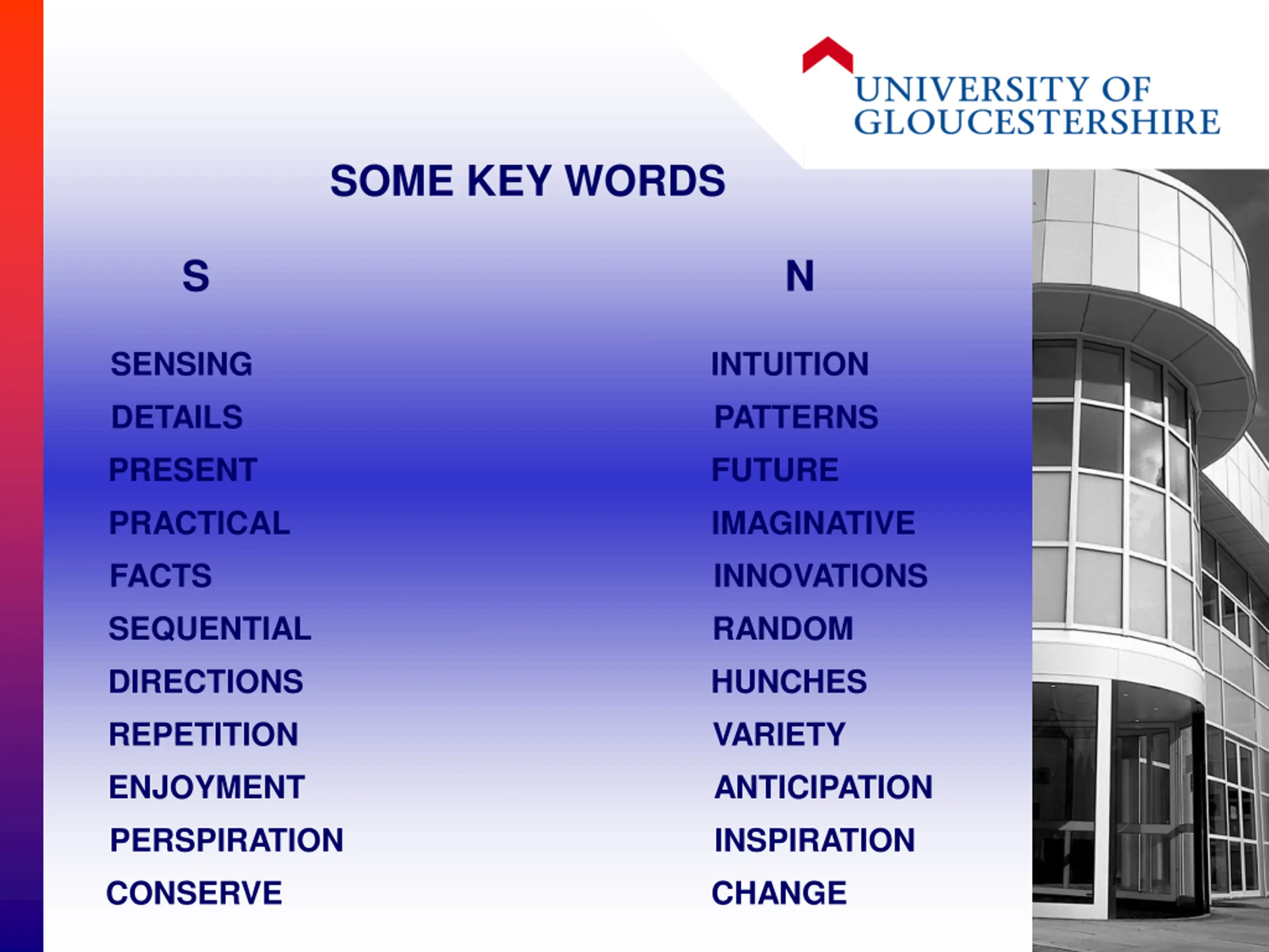 SOME KEY WORDS S N SENSING DETAILS PRESENT INTUITION PATTERNS FUTURE IMAGINATIVE INNOVATIONS RANDOM HUNCHES VARIETY ANTICIPATION INSPIRATION CHANGE PRACTICAL FACTS SEQUENTIAL DIRECTIONS REPETITION ENJOYMENT PERSPIRATION CONSERVE