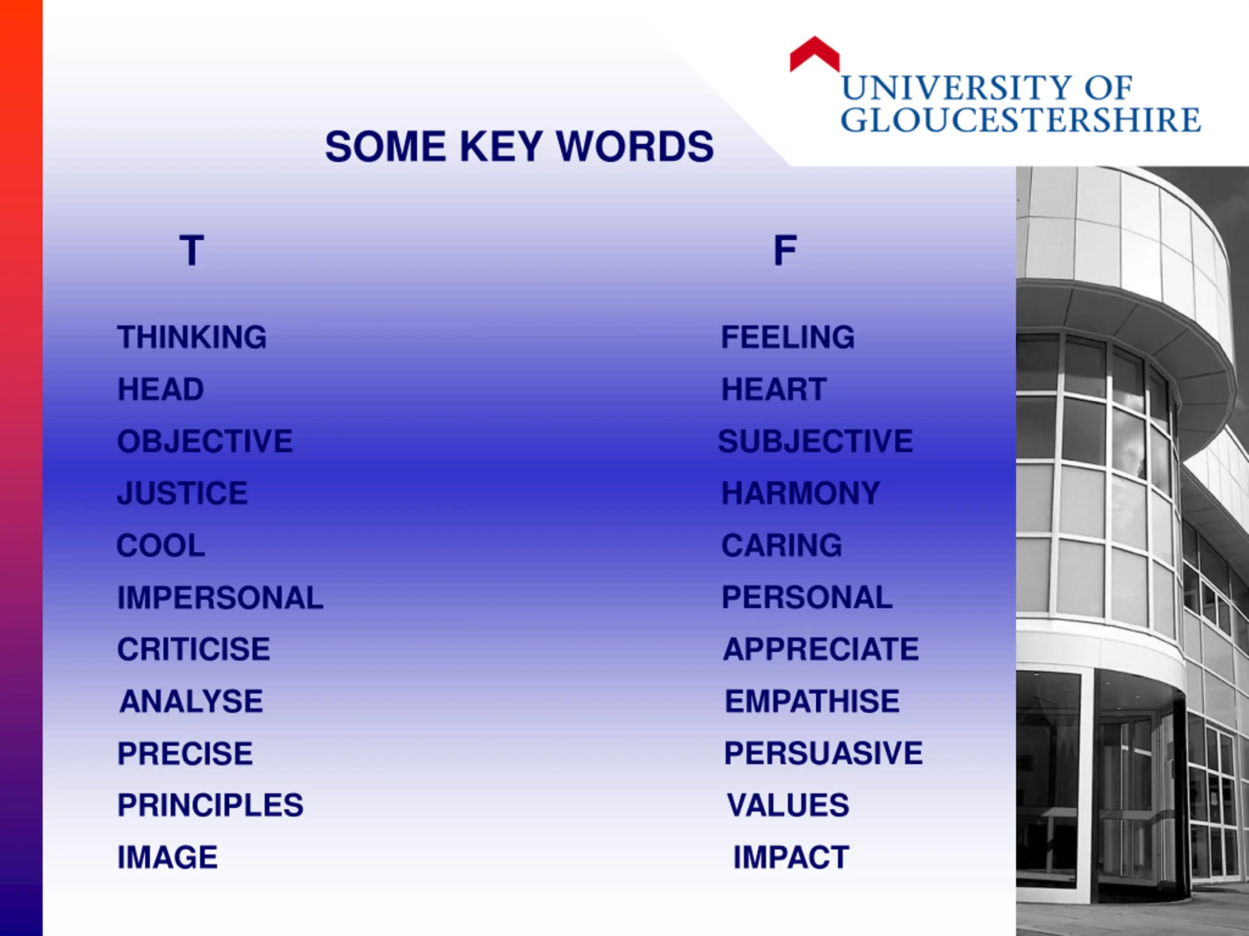 SOME KEY WORDS T F THINKING HEAD OBJECTIVE FEELING HEART SUBJECTIVE HARMONY CARING PERSONAL APPRECIATE EMPATHISE PERSUASIVE VALUES IMPACT JUSTICE COOL IMPERSONAL CRITICISE ANALYSE PRECISE PRINCIPLES IMAGE