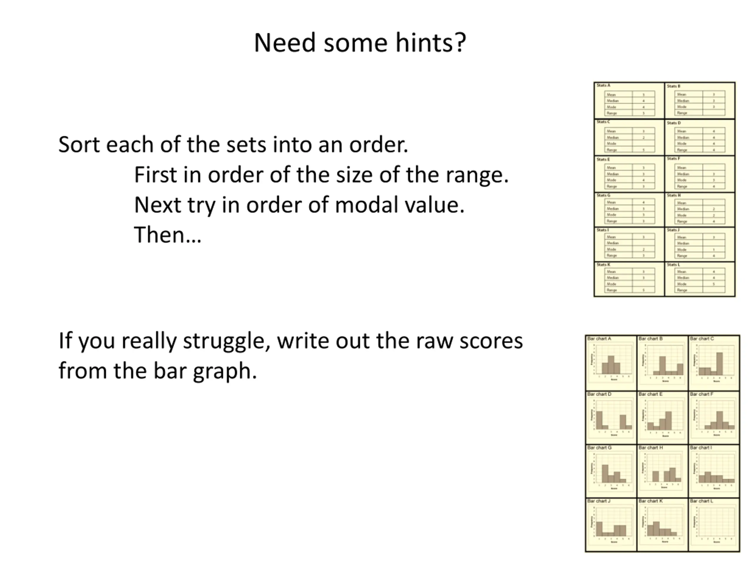 Need some hints? Sort each of the sets into an order. First in order of the size of the range. Next try in order of modal value. Then If you really struggle, write out the raw scores from the bar graph.