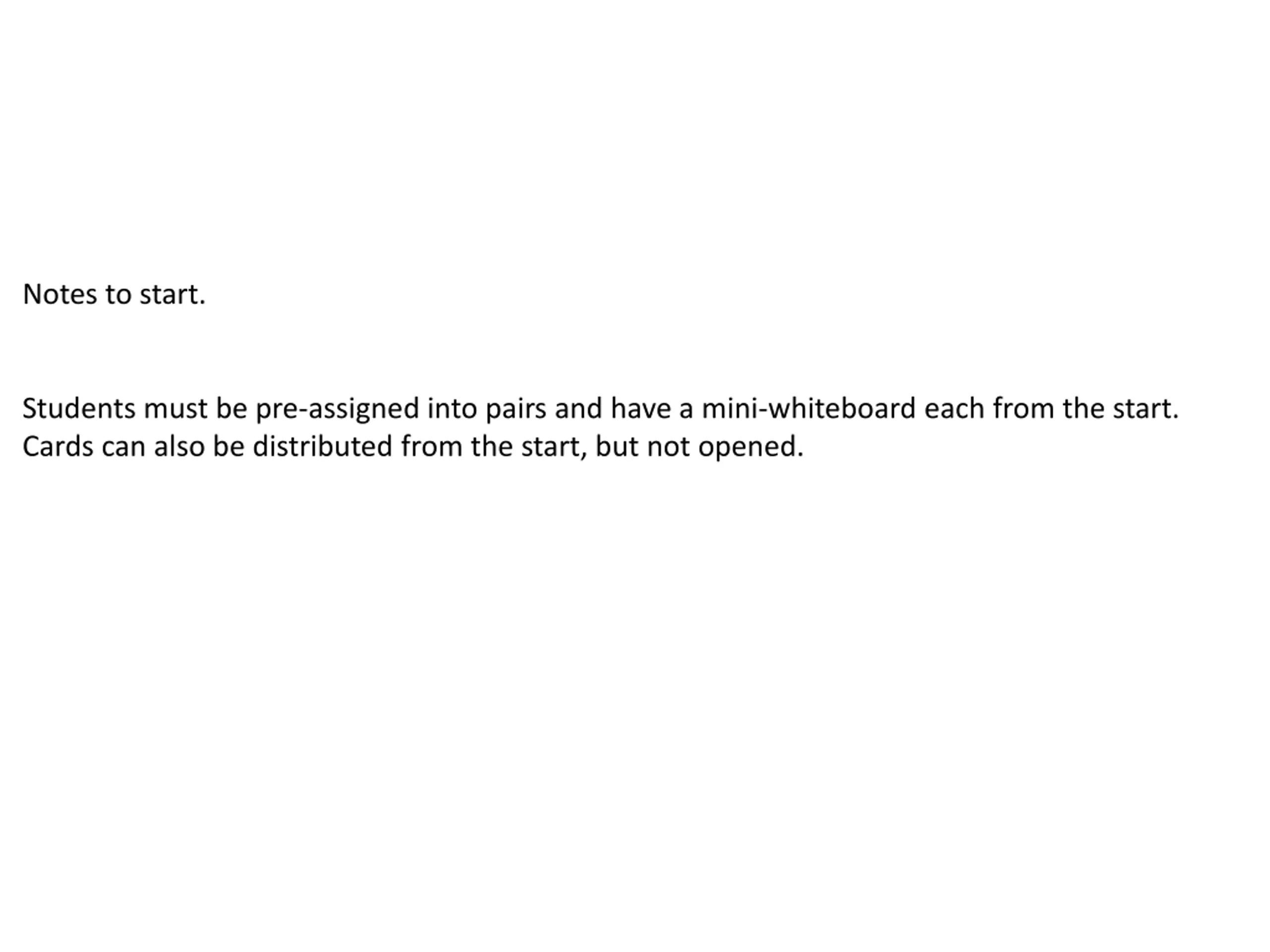 Notes to start. Students must be pre-assigned into pairs and have a mini-whiteboard each from the start. Cards can also be distributed from the start, but not opened.