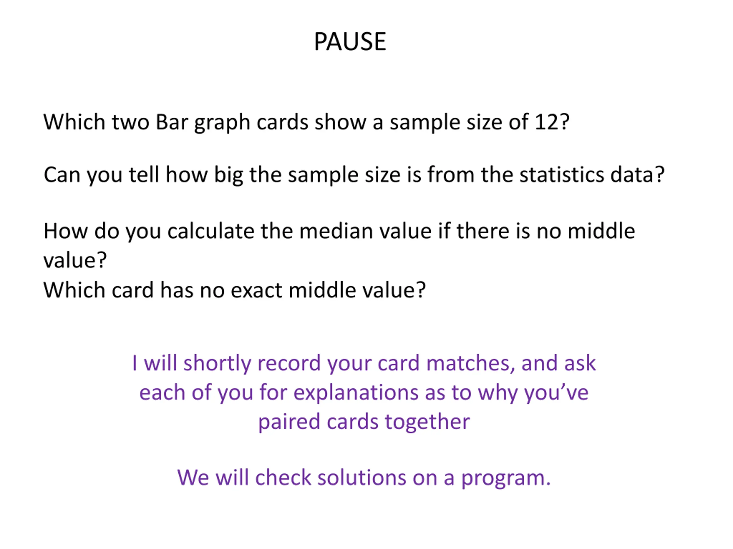 PAUSE Which two Bar graph cards show a sample size of 12? Can you tell how big the sample size is from the statistics data? How do you calculate the median value if there is no middle value? Which card has no exact middle value? I will shortly record your card matches, and ask each of you for explanations as to why you ve paired cards together We will check solutions on a program.