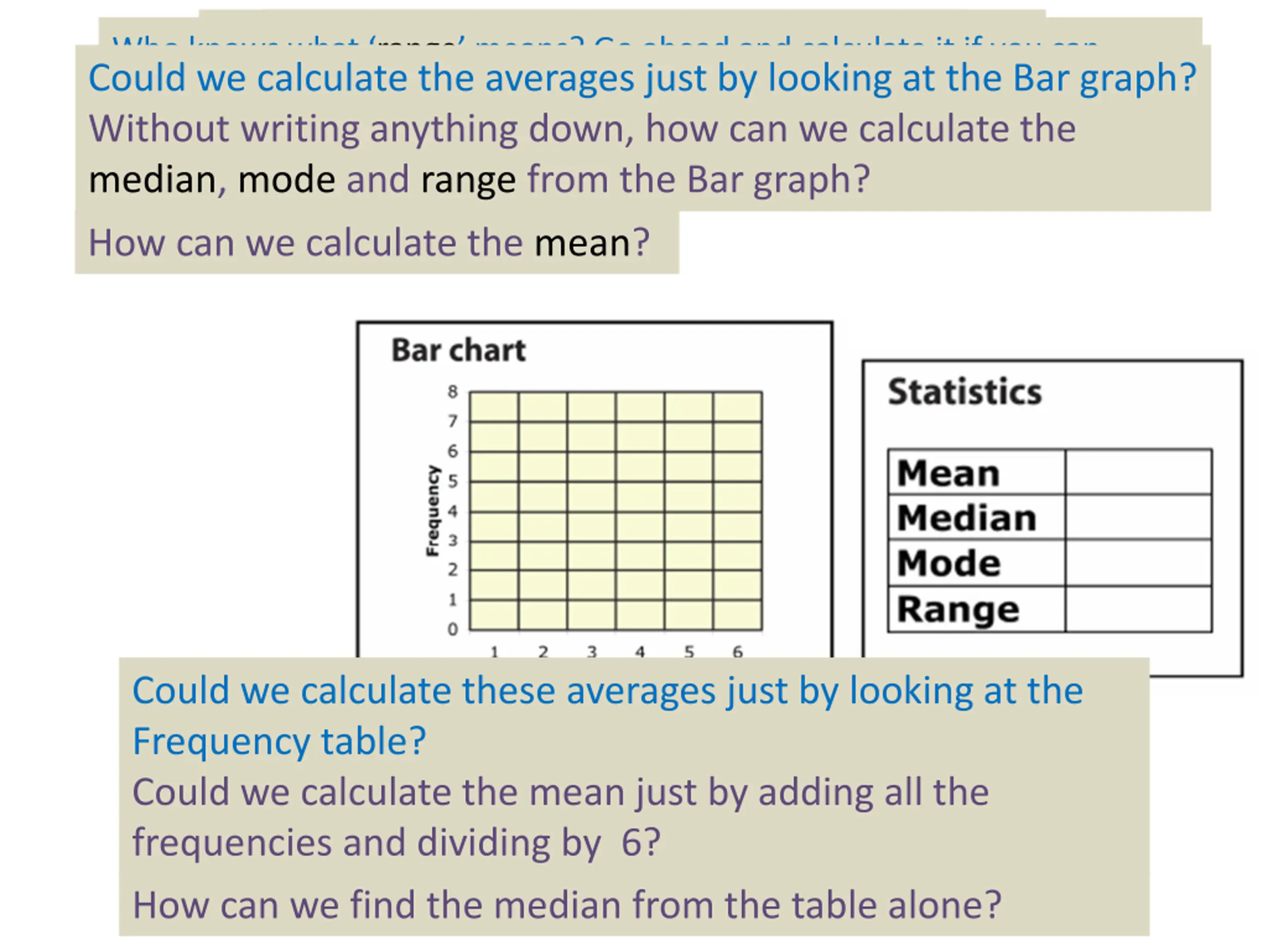 Try to write the 6 numbers that would go in this table. Work with your partner if necessary. plot the data from the table. Everyone else Everyone else Everyone else Everyone else Could we calculate the averages just by looking at the Bar graph? Without writing anything down, how can we calculate the Now sketch a bar graph like this, and Who knows what mean means? Go ahead and calculate it if you can. Who knows what median means? Go ahead and calculate it if you can. Who knows what mode means? Go ahead and calculate it if you can. Who knows what range means? Go ahead and calculate it if you can. Averages Secretly write your favourite integer between 1 and 6 on your whiteboard. median, mode and range from the Bar graph? How can we calculate the mean? Could we calculate these averages just by looking at the Frequency table? Could we calculate the mean just by adding all the frequencies and dividing by 6? How can we find the median from the table alone?