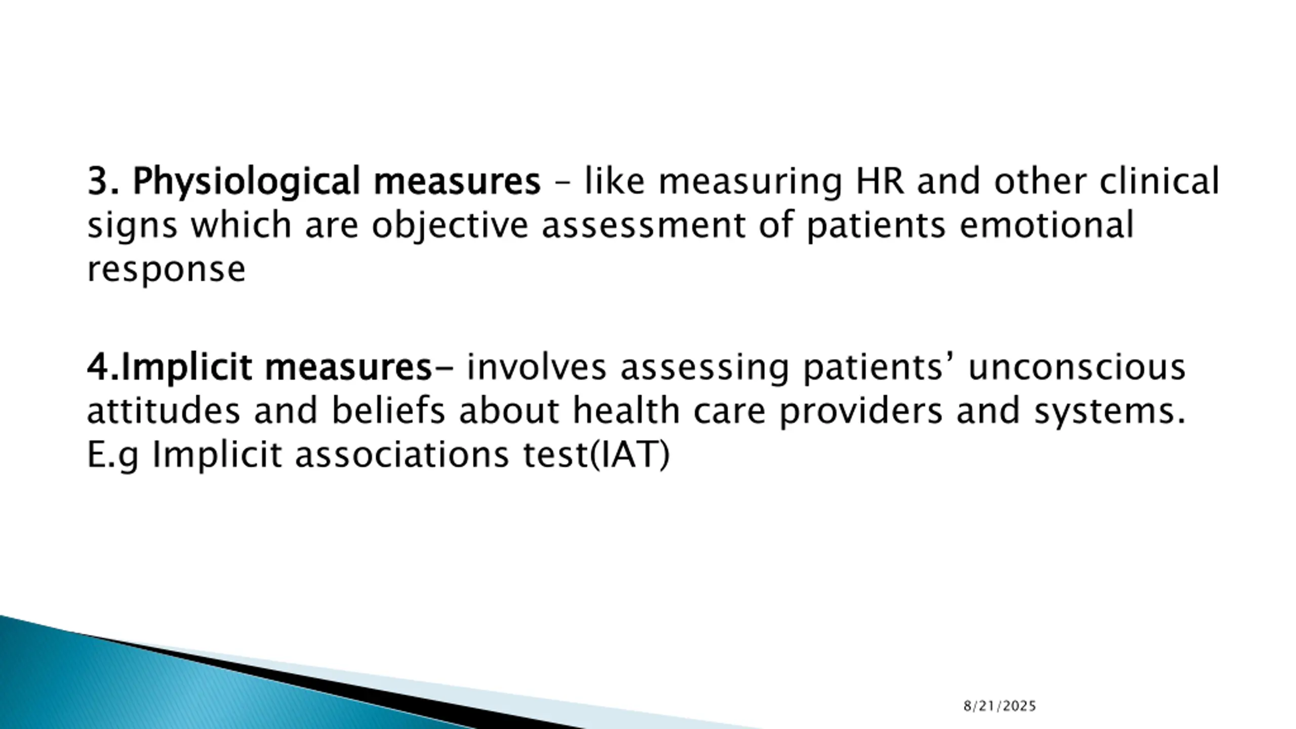 3. Physiological measures signs which are objective assessment of patients emotional response 3. Physiological measures like measuring HR and other clinical 4.Implicit measures attitudes and beliefs about health care providers and systems. E.g Implicit associations test(IAT) 4.Implicit measures- - involves assessing patients unconscious 8/21/2025