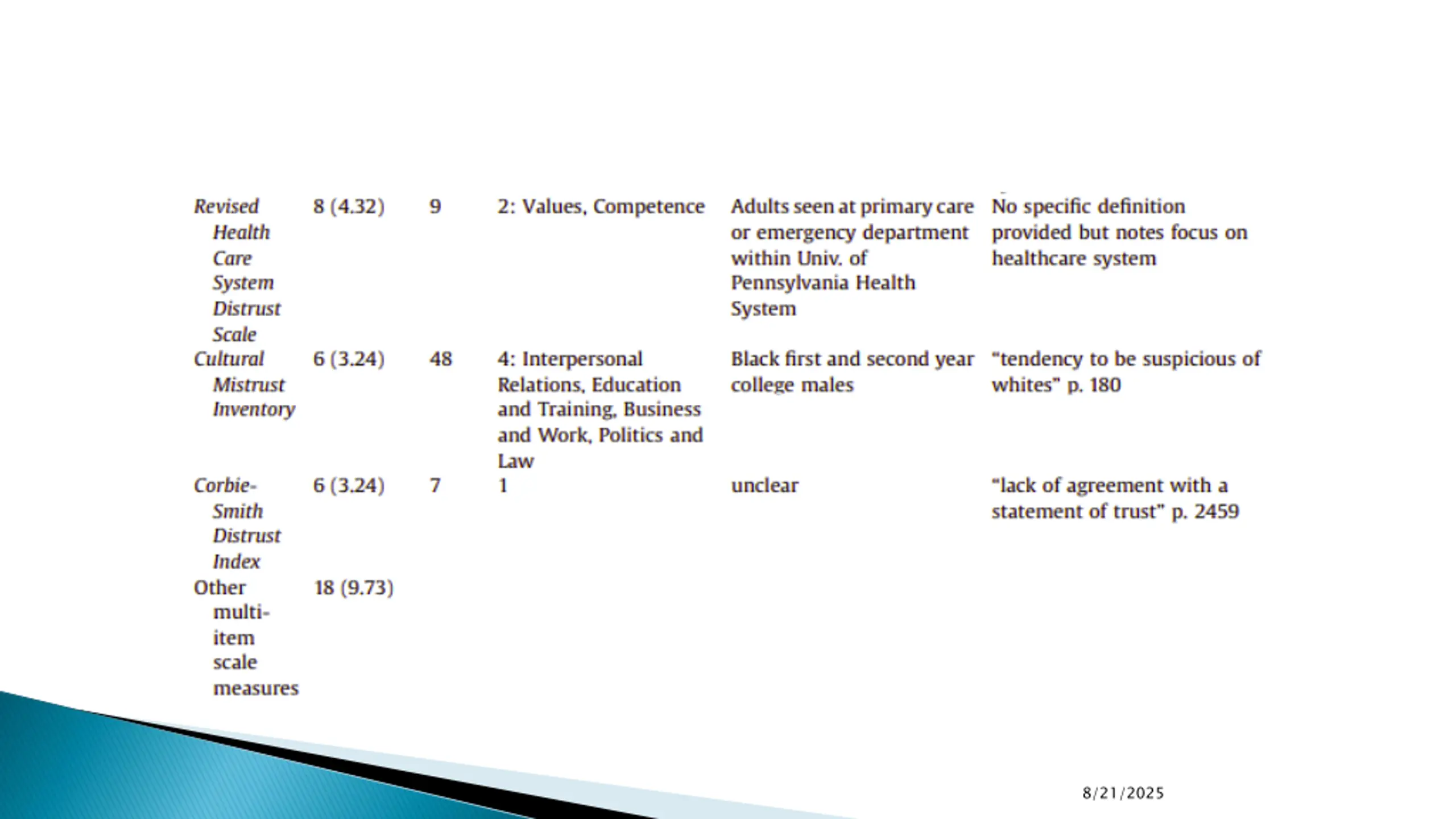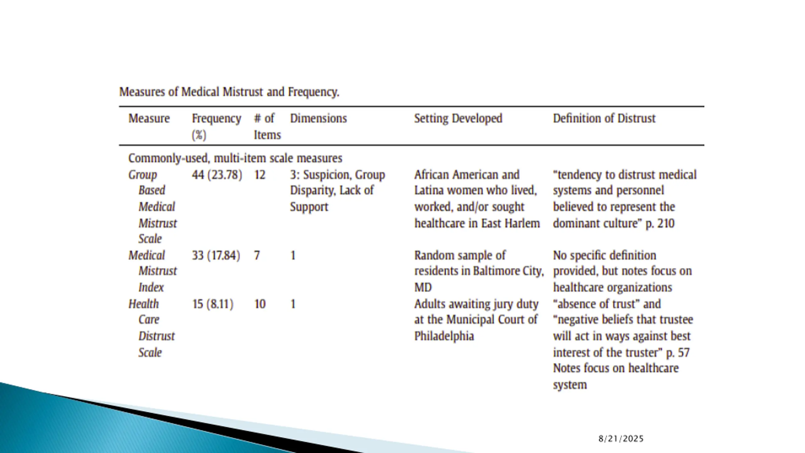 Can be challenging as it is complex construct with various dimensions that can be difficult to quantify. Medical mistrust is seen as a barrier to health promotion and addressing health disparities Number of measuring tools 8/21/2025